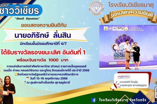 ขอแสดงความยินดีกับนายอภิรักษ์ ลั่นสิน นักเรียนชั้นมัธยมศึกษาปีที่ 4/7 ได้รับถ้วยรางวัล รองชนะเลิศอันดับหนึ่ง พร้อมเงินรางวัล 1000 บาท ในการแข่งขันการต่อคำศัพท์ภาษาไทย (คำคม)รายการเอ็ดดูพลอยส์ เอแม็ท คำคม ครอสเวิร์ดเกม และซูโดกุ ชิงแชมป์ภาคใต้ ประจำปี 2568 ชิงถ้วยรางวัลรัฐมนตรีว่าการกระทรวงศึกษาธิการ วันที่ 15-16 พฤศจิกายน 2568ณ ศูนย์การค้าเซ็นทรัล สุราษฎร์ธานีครูผู้ควบคุมทีมนางวรรณี ด้วงนุ้ยนายประยุทธ เชาวน์เสฎฐกุล