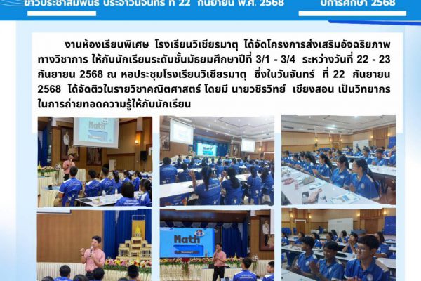 งานห้องเรียนพิเศษ โรงเรียนวิเชียรมาตุ ได้จัดโครงการส่งเสริมอัจฉริยภาพทางวิชาการ ให้กับนักเรียนระดับชั้นมัธยมศึกษาปีที่ 3/1 – 3/4 ระหว่างวันที่ 22 – 23 กันยายน 2568 ณ หอประชุมโรงเรียนวิเชียรมาตุ ซึ่งในวันจันทร์ ที่ 22 กันยายน 2568 ได้จัดติวในรายวิชาคณิตศาสตร์ โดยมี นายวชิรวิทย์ เชียงสอน เป็นวิทยากรในการถ่ายทอดความรู้ให้กับนักเรียน