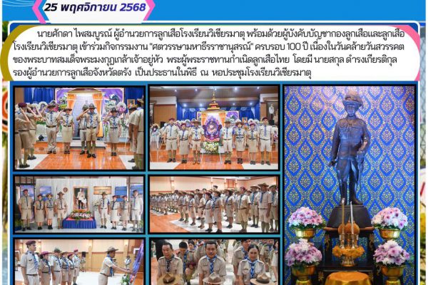 นายศักดา ไพสมบูรณ์ ผู้อำนวยการลูกเสือโรงเรียนวิเชียรมาตุ พร้อมด้วยผู้บังคับบัญชากองลูกเสือและลูกเสือโรงเรียนวิเชียรมาตุ เข้าร่วมกิจกรรมงาน “ศตวรรษามหาธีรราชานุสรณ์” ครบรอบ 100 ปี เนื่องในวันคล้ายวันสวรรคตของพระบาทสมเด็จพระมงกุฎเกล้าเจ้าอยู่หัว พระผู้พระราชทานกำเนิดลูกเสือไทย โดยมี นายสกุล ดำรงเกียรติกุล รองผู้อำนวยการลูกเสือจังหวัดตรัง เป็นประธานในพิธี ณ หอประชุมโรงเรียนวิเชียรมาตุ