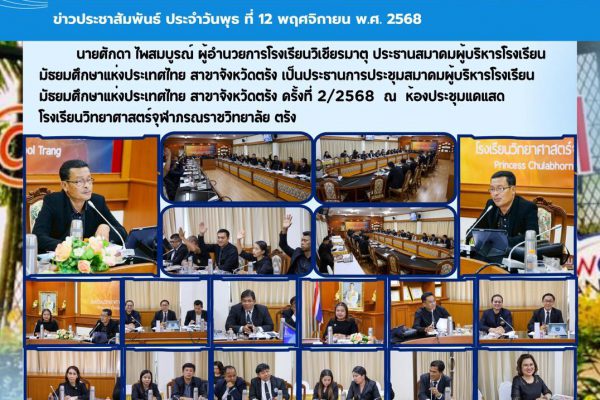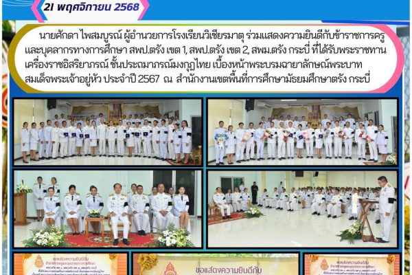 นายศักดา ไพสมบูรณ์ ผู้อำนวยการโรงเรียนวิเชียรมาตุ ร่วมแสดงความยินดีกับข้าราชการครูและบุคลากรทางการศึกษา สพป.ตรัง เขต 1, สพป.ตรัง เขต 2, สพม.ตรัง กระบี่ ที่ได้รับพระราชทานเครื่องราชอิสริยาภรณ์ ชั้นประถมาภรณ์มงกุฎไทย เบื้องหน้าพระบรมฉายาลักษณ์พระบาทสมเด็จพระเจ้าอยู่หัว ประจำปี 2567 ณ สำนักงานเขตพื้นที่การศึกษามัธยมศึกษาตรัง กระบี่