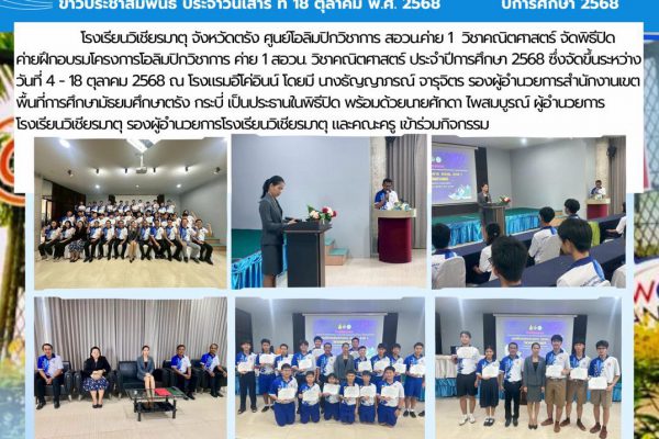 โรงเรียนวิเชียรมาตุ จังหวัดตรัง ศูนย์โอลิมปิกวิชาการ สอวน.ค่าย 1 วิชาคณิตศาสตร์ จัดพิธีปิดค่ายฝึกอบรมโครงการโอลิมปิกวิชาการ ค่าย 1 สอวน. วิชาคณิตศาสตร์ ประจำปีการศึกษา 2568 ซึ่งจัดขึ้นระหว่างวันที่ 4 – 18 ตุลาคม 2568 ณ โรงแรมอีโค่อินน์ โดยมี นางธัญญาภรณ์ จารุจิตร รองผู้อำนวยการสำนักงานเขตพื้นที่การศึกษามัธยมศึกษาตรัง กระบี่ เป็นประธานในพิธีปิด พร้อมด้วยนายศักดา ไพสมบูรณ์ ผู้อำนวยการโรงเรียนวิเชียรมาตุ รองผูัอำนวยการโรงเรียนวิเชียรมาตุ และคณะครู เข้าร่วมกิจกรรม