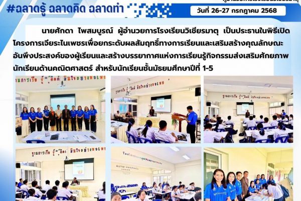 นายศักดา ไพสมบูรณ์ ผู้อำนวยการโรงเรียนวิเชียรมาตุ เป็นประธานในพิธีเปิด โครงการเจียระไนเพชรเพื่อยกระดับผลสัมฤทธิ์ทางการเรียนและเสริมสร้างคุณลักษณะอันพึงประสงค์ของผู้เรียนและสร้างบรรยากาศแห่งการเรียนรู้ กิจกรรมส่งเสริมศักยภาพนักเรียนด้านคณิตศาสตร์ สำหรับนักเรียนชั้นมัธยมศึกษาปีที่ 1-5