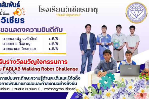 ได้รับรางวัลขวัญใจกรรมการ กิจกรรม FABLAB Walking Robot Challenge โครงการบ่มเพาะทักษะความรู้ด้านสะเต็มและโค้ดดิ้ง เพื่อการพัฒนาเยาวชนและกำลังคนอย่างยั่งยืนสมาชิกนายกนกณัฐ จงรักวิทย์ ม.5/8นายยศกร ถิ่นชาญ ม.5/8นายชนาเมธ ไกรเกรอะ ม.5/6ครูที่ปรึกษา : นายอนิส หมานมานะ , นางสาวชฎาพร เชียรศรี