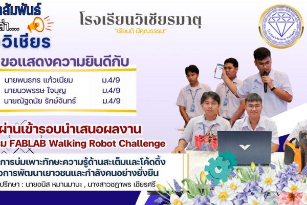 ขอแสดงความยินดี ผ่านเข้ารอบนำเสนอผลงาน กิจกรรม FABLAB Walking Robot Challenge โครงการบ่มเพาะทักษะความรู้ด้านสะเต็มและโค้ดดิ้ง เพื่อการพัฒนาเยาวชนและกำลังคนอย่างยั่งยืนสมาชิกนายพนธกร แก้วเนียม ม.4/9นายนวพรรษ ใจบุญ ม.4/9นายณัฐดนัย รักษ์จันทร์ ม.4/9ครูที่ปรึกษา : นายอนิส หมานมานะ , นางสาวชฎาพร เชียรศรี