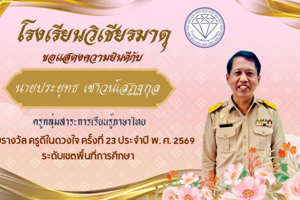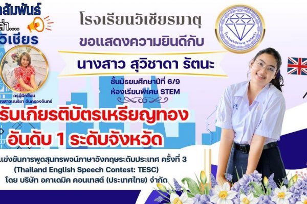 ขอแสดงความยินดีกับ นางสาวสุวิชาดา รัตนะ ชั้น ม.6/9 นักเรียนห้องเรียนพิเศษ STEM ได้รับรางวัลเกียรติบัตรเหรียญทอง อันดับ 1 ระดับจังหวัด การแข่งขันการพูดสุนทรพจน์ภาษาอังกฤษระดับประเทศ ครั้งที่ 3 (Thailand English Speech Contest) ซึ่งจัดโดย บริษัท อคาเดมิค คอนเทสต์ (ประเทศไทย) จำกัด ครูผู้ฝึกซ้อม คือ นางสาวเณริยา ต้นครองจันทร์