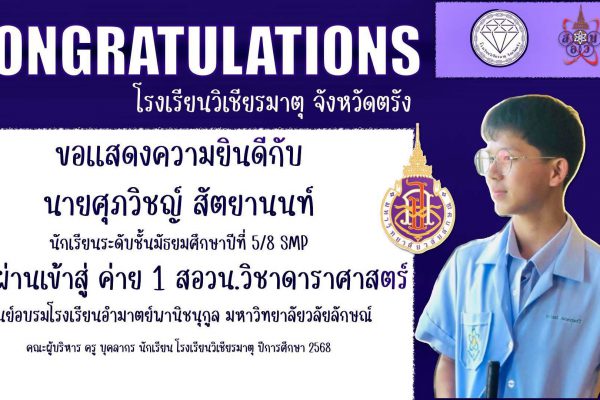 ขอแสดงความยินดีกับ นายศุภวิชญ์ สัตยานนท์ที่ผ่านการคัดเลือกค่าย 1 สอวน. วิชาดาราศาสตร์ศูนย์อบรมโรงเรียนอำมาตย์พานิชกุล มหาวิทยาลัยวลัยลักษณ์