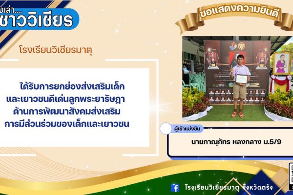 ขอแสดงความยินดี🎉นายภาณุภัทร หลงกลาง ม.5/9ได้รับการยกย่องส่งเสริมเด็กและเยาวชนดีเด่นลูกพระยารัษฎา ด้านการพัฒนาสังคมส่งเสริมการมีส่วนร่วมของเด็กและเยาวชน