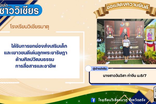 ขอแสดงความยินดี🎉นางสาววันวิสา ท่าจีน ม.6/7ได้รับการยกย่องส่งเสริมเด็กและเยาวชนดีเด่นลูกพระยารัษฎา ด้านศิลปวัฒนธรรม การสื่อสารและอาชีพ