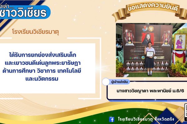 ขอแสดงความยินดี🎉นางสาววิชญาดา พละพานิชย์ ม.6/6ได้รับการยกย่องส่งเสริมเด็กและเยาวชนดีเด่นลูกพระยารัษฎา ด้านการศึกษา วิชาการ เทคโนโลยี และนวัตกรรม