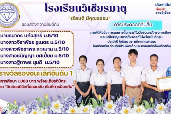 การประกวดคลิปสั้น ภายใต้หัวข้อ การลดการตั้งครรภ์ในวัยรุ่นตามโครงการป้องกันและแก้ไขปัญหาการตั้งครรภ์ไม่พร้อมในวัยรุ่น ประจำปี ๒๕๖๘ สภาเด็กและเยาวชนจังหวัดตรัง ร่วมกับบ้านพักเด็กและครอบครัวจังหวัดตรัง รางวัลรองชนะเลิศอันดับ ๑ ทุนการศึกษา ๑,๐๐๐ บาท พร้อมเกียรติบัตร ชื่อผลงาน “คิดก่อนมีรักที่ปลอดภัย เริ่มที่การป้องกัน” นายธนากร แก้วสุทธิ์ ม.5/10 นางสาวจิราพัชร ชูเนตร ม.5/10 นางสาวพิชชาพร หะหมาน ม.5/10 นางสาวชนัญญา ยศเปี่ยม ม.5/10 นางสาวฐิตาพร ชุมดี ม.5/10