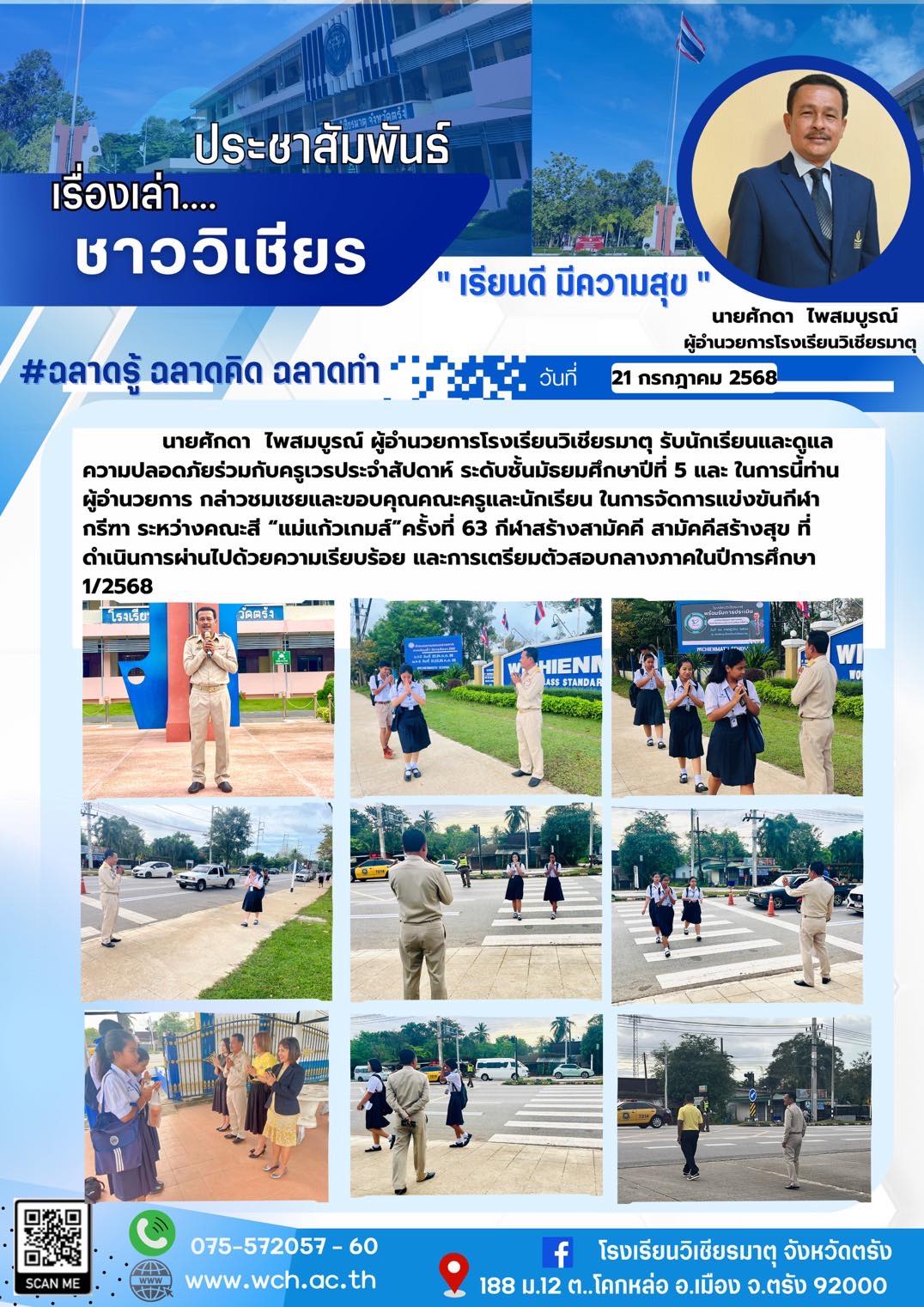 นายศักดา ไพสมบูรณ์ ผู้อำนวยการโรงเรียนวิเชียรมาตุ รับนักเรียนและดูแลความปลอดภัยร่วมกับครูเวรประจำสัปดาห์ ระดับชั้นมัธยมศึกษาปีที่ 5 ในการนี้ท่านผู้อำนวยการ กล่าวชมเชยและขอบคุณคณะครูและนักเรียน ในการจัดการแข่งขันกีฬา-กรีฑา ระหว่างคณะสี “แม่แก้วเกมส์”ครั้งที่ 63 กีฬาสร้างสามัคคี สามัคคีสร้างสุข ที่ดำเนินการผ่านไปด้วยความเรียบร้อย และการเตรียมตัวสอบกลางภาคในปีการศึกษา 1/2568