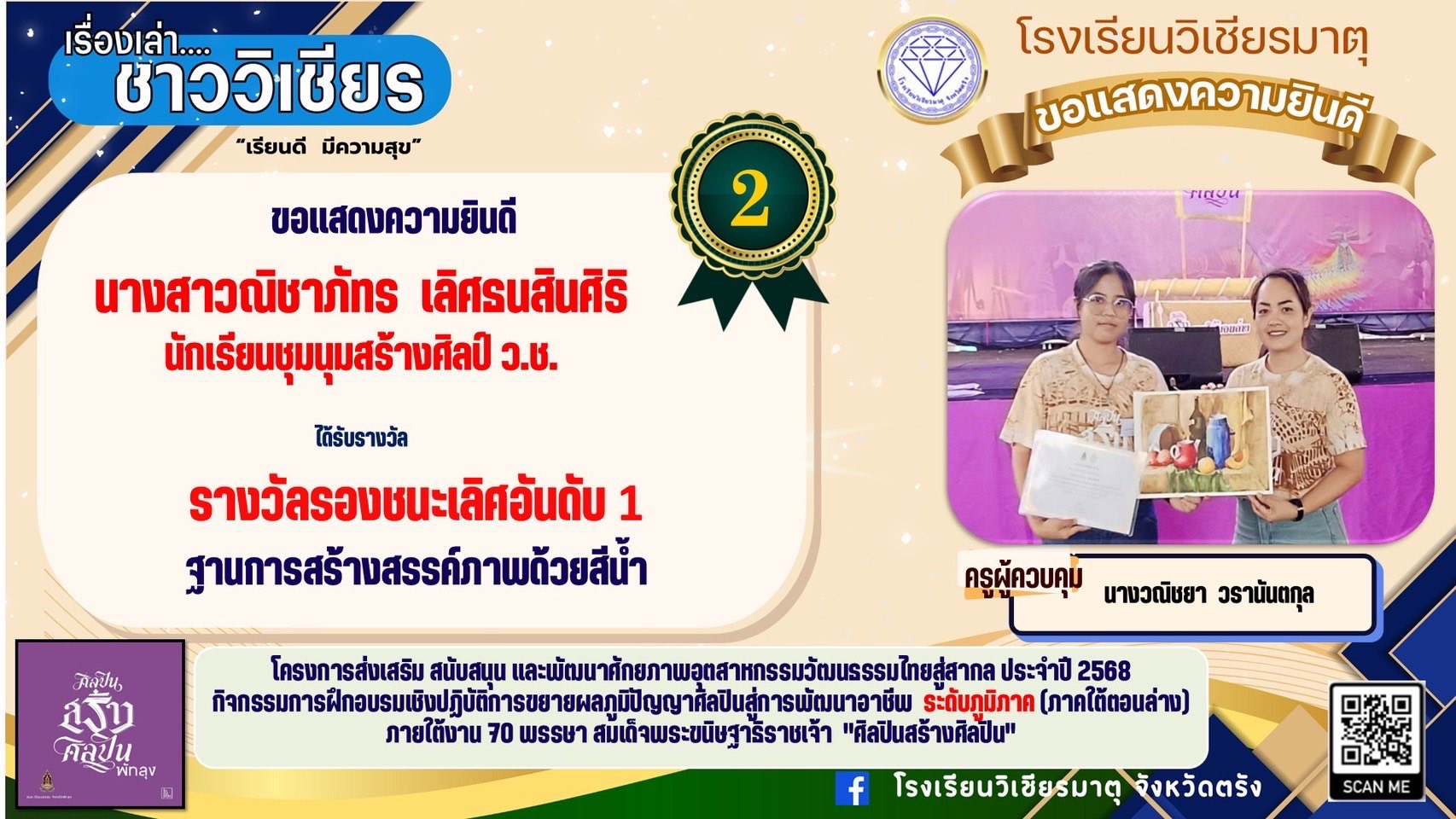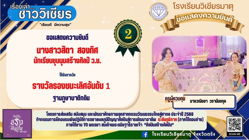 ขอแสดงความยินดีกับนักเรียน ที่ได้รับรางวัลจากการแข่งขันโครงการส่งเสริม สนับสนุน และพัฒนาศักยภาพอุตสาหกรรมวัฒนธรรมไทยสู่สากล ประจำปี 2568 กิจกรรมการฝึกอบรมเชิงปฏิบัติการขยายผลภูมิปัญญาศิลปินสู่การพัฒนาอาชีพ ระดับภูมิภาค (ภาคใต้ตอนล่าง)