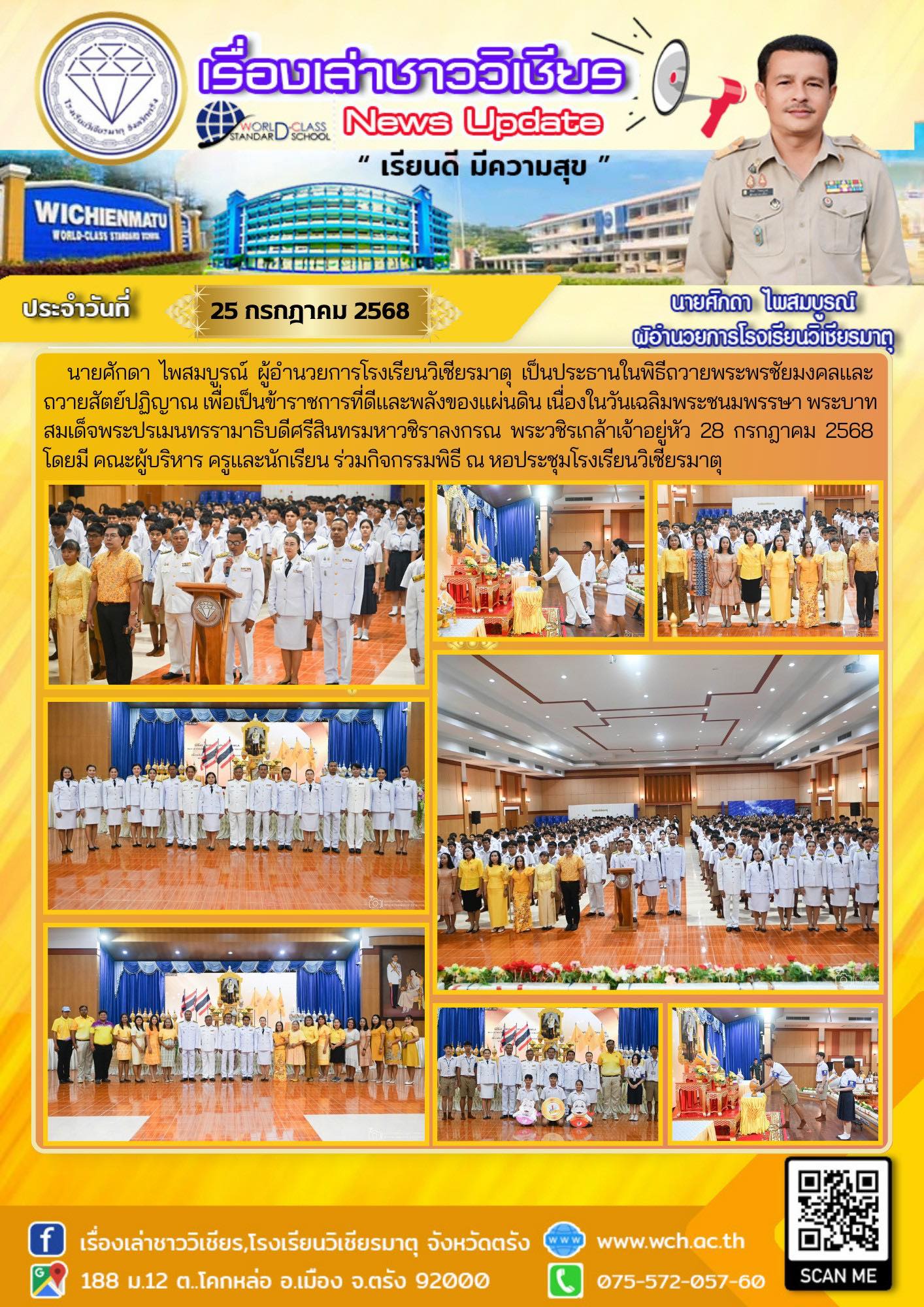 นายศักดา ไพสมบูรณ์ ผู้อำนวยการโรงเรียนวิเชียรมาตุ เป็นประธานในพิธีถวายพระพรชัยมงคลและถวายสัตย์ปฏิญาณ เพื่อเป็นข้าราชการที่ดีและพลังของแผ่นดิน เนื่องในวันเฉลิมพระชนมพรรษา พระบาทสมเด็จพระปรเมนทรรามาธิบดีศรีสินทรมหาวชิราลงกรณ พระวชิรเกล้าเจ้าอยู่หัว 28 กรกฎาคม 2568 โดยมี คณะผู้บริหาร ครูและนักเรียน ร่วมกิจกรรมพิธี ณ หอประชุมโรงเรียนวิเชียรมาตุ