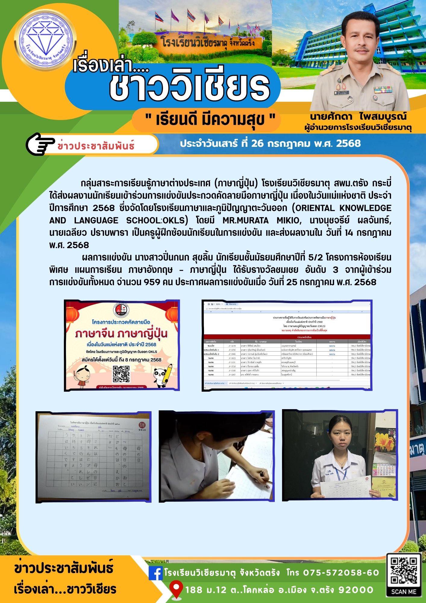 กลุ่มสาระการเรียนรู้ภาษาต่างประเทศ (ภาษาญี่ปุ่น) โรงเรียนวิเชียรมาตุ สพม.ตรัง กระบี่ ได้ส่งผลงานนักเรียนเข้าร่วมการแข่งขันประกวดคัดลายมือภาษาญี่ปุ่น เนื่องในวันแม่แห่งชาติ ประจำปีการศึกษา 2568 ซึ่งจัดโดยโรงเรียนภาษาและภูมิปัญญาตะวันออก (Oriental Knowledge and Language School:OKLS) โดยมี Mr.Murata Mikio, นางนุชจรีย์ ผลจันทร์, นายเฉลียว ปราบพารา เป็นครูผู้ฝึกซ้อมนักเรียนในการแข่งขัน และส่งผลงานใน วันที่ 14 กรกฎาคม พ.ศ. 2568