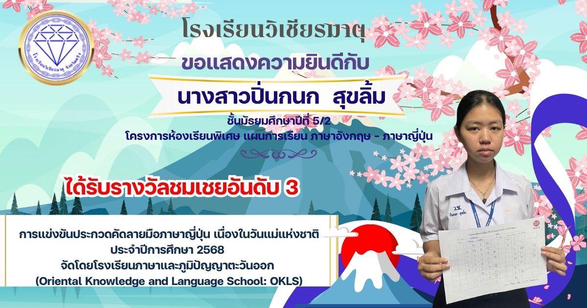 ได้รับรางวัลชมเชยอันดับ3 การแข่งขันประกวดคุดลายมือภาษาญี่ปุ่น เนื่องในวันแม่แห่งชาติ ปี2568