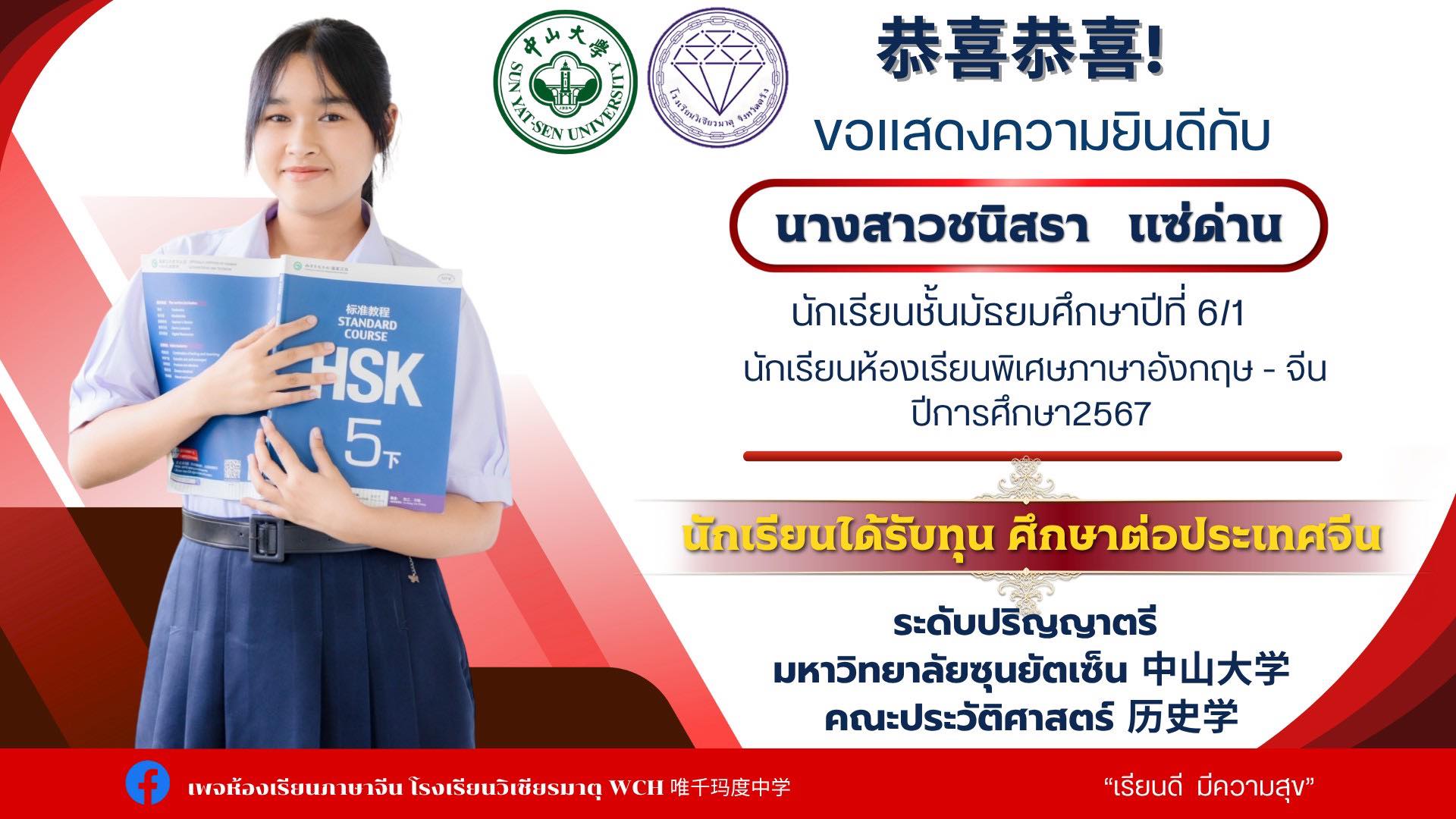 นักเรียนชั้นมัธยมศึกษาปีที่6/1 นักเรียนห้องเรียนพิเศษภาษาอังกฤษ จีน ปีการศึกษา 2567 ได้รับทุน 一带一路 ศึกษาต่อประเทศจีน ทุนเต็มจำนวน ระดับปริญญาตรี มหาวิทยาลัยซุนยัตเซ็น(中山大学) คณะประวัติศาสตร์ 历史学