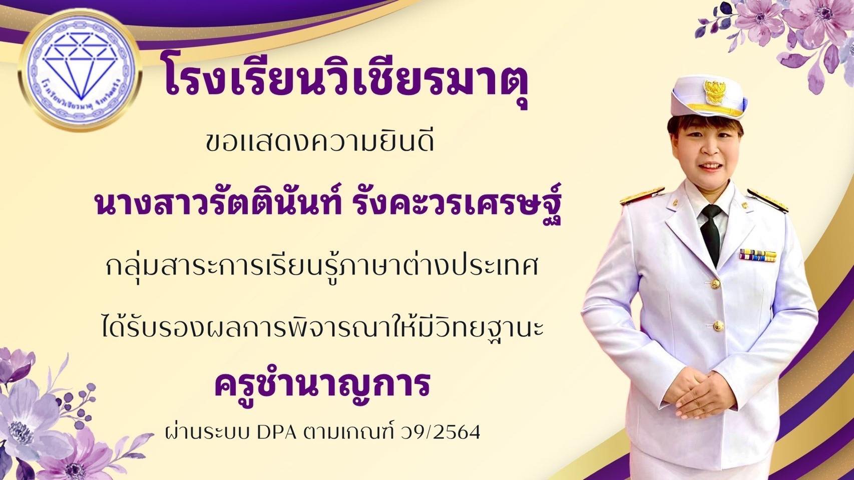 ขอแสดงความยินดีกับนางสาวรัตตินันท์ รังคะวรเศรษฐ์ กลุ่มสาระการเรียนรู้ภาษาต่างประเทศ ได้รับรองผลการพิจารณาให้มีวิทยฐานะ ครูชำนาญการ ผ่านระบบ DPA ตามเกณฑ์ ว9/2564