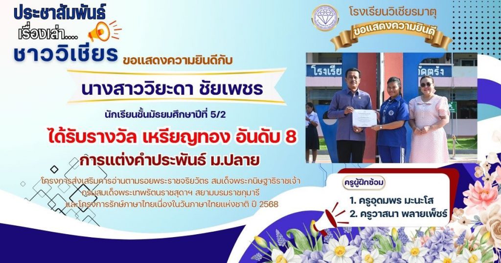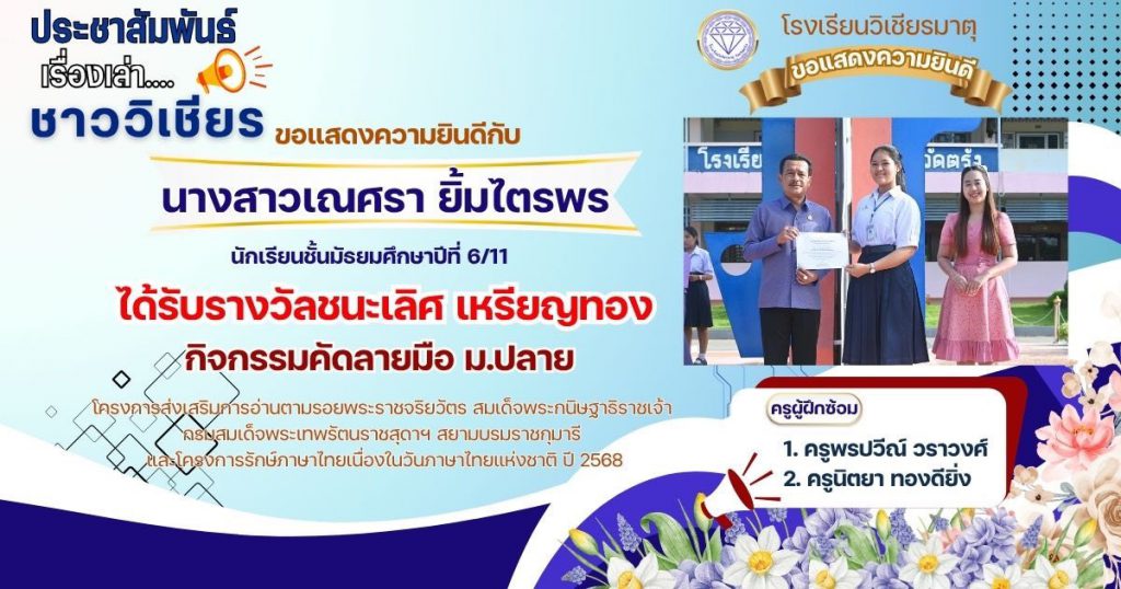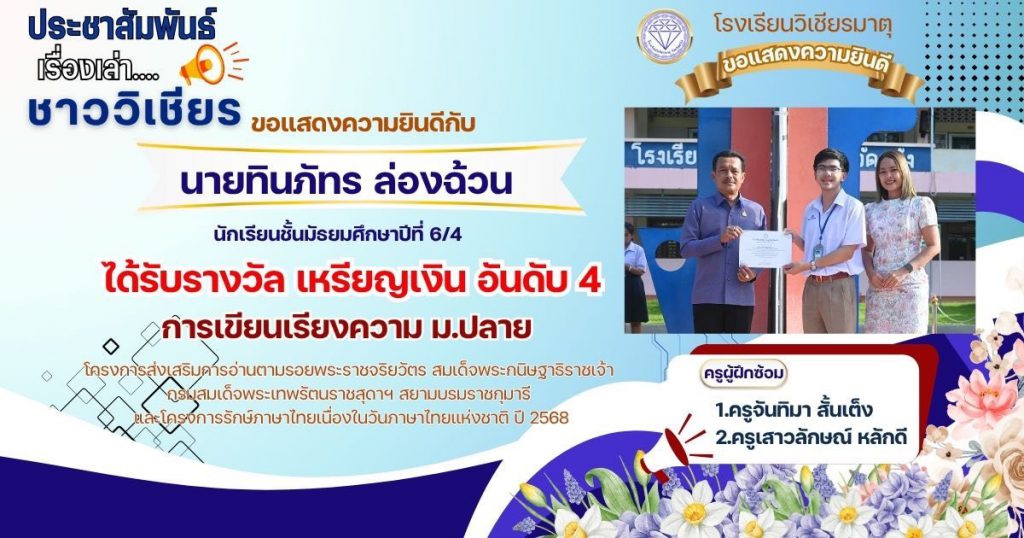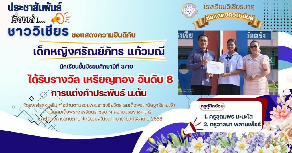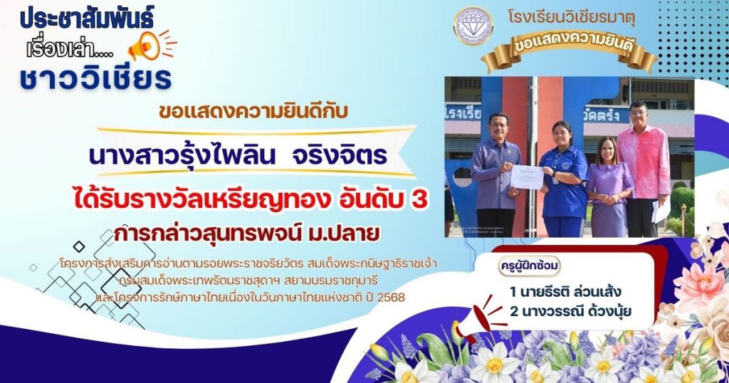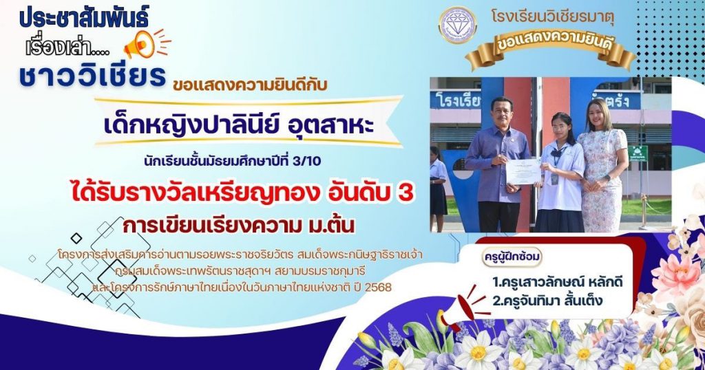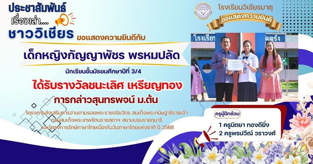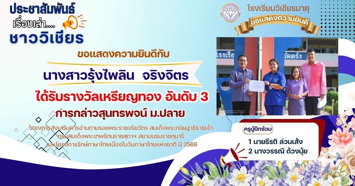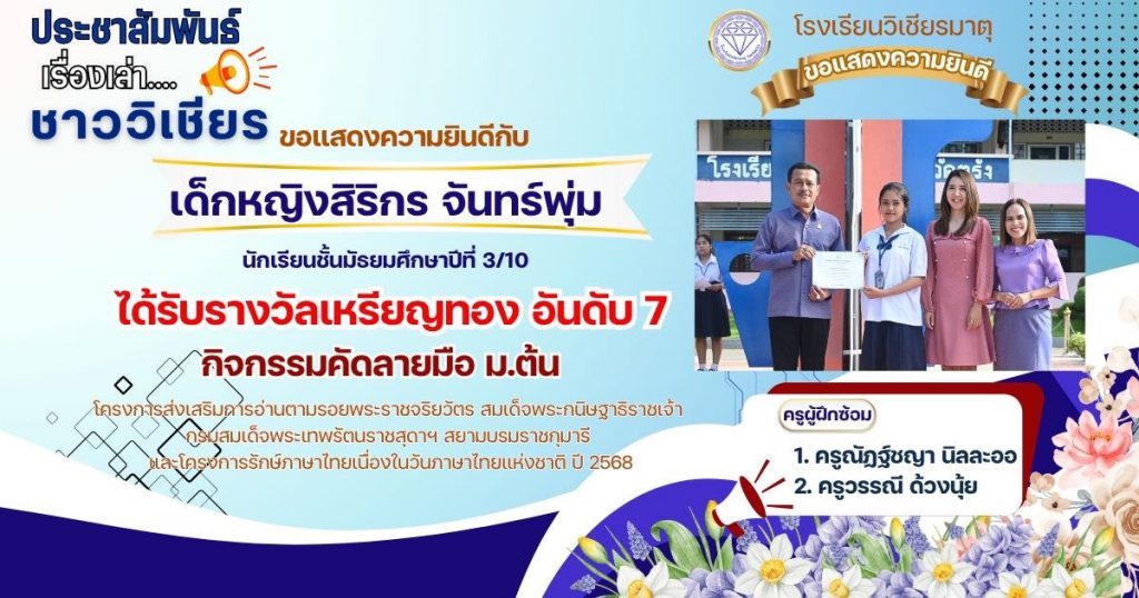 กลุ่มสาระการเรียนรู้ภาษาไทย โรงเรียนวิเชียรมาตุ ได้ส่งนักเรียนต้นแบบความสามารถด้านการอ่านและทักษะภาษาไทย ระดับสำนักงานเขตพื้นที่การศึกษา ประจำปี 2568 ตามโครงการส่งเสริมการอ่านตามรอยพระราชจริยวัตร สมเด็จพระกนิษฐาธิราชเจ้า กรมสมเด็จพระเทพรัตนราชสุดาฯ สยามบรมราชกุมารี และโครงการรักษ์ภาษาไทยเนื่องในวันภาษาไทยแห่งชาติ ปี 2568 โดยมีผลการแข่งขัน ดังนี้
