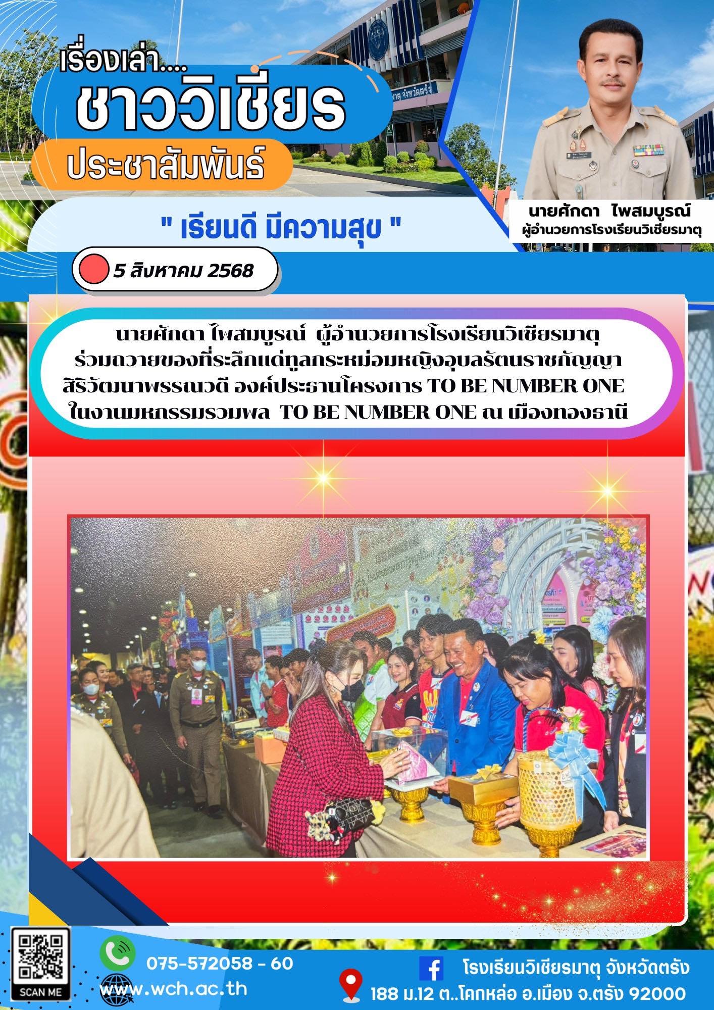 นายศักดา ไพสมบูรณ์ ผู้อำนวยการโรงเรียนวิเชียรมาตุ ร่วมถวายของที่ระลึกแด่ทูลกระหม่อมหญิงอุบลรัตนราชกัญญา สิริวัฒนาพรรณวดี องค์ประธานโครงการ TO BE NUMBER ONE