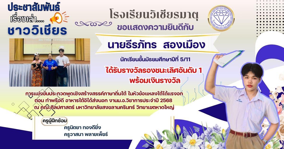 ขอแสดงความยินดีกับ นายธีรภัทร สองเมือง นักเรียนชั้นมัธยมศึกษาปีที่ 5/11 ได้รับ รางวัลรองชนะเลิศอันดับ 1 พร้อมเงินรางวัล การแข่งขันประกวดพูดเชิงสร้างสรรค์ภาษาถิ่นใต้ ในหัวข้อแหลงใต้ได้แรงอกตอน ทำพรือดี อาหารใต้อิได้ส่งนอก งานม.อ.วิชาการประจำปี 2568 วันพุธที่ 6 สิงหาคม 2568 ณ คณะศิลปศาสตร์ มหาวิทยาลัยสงขลานครินทร์ วิทยาเขตหาดใหญ่