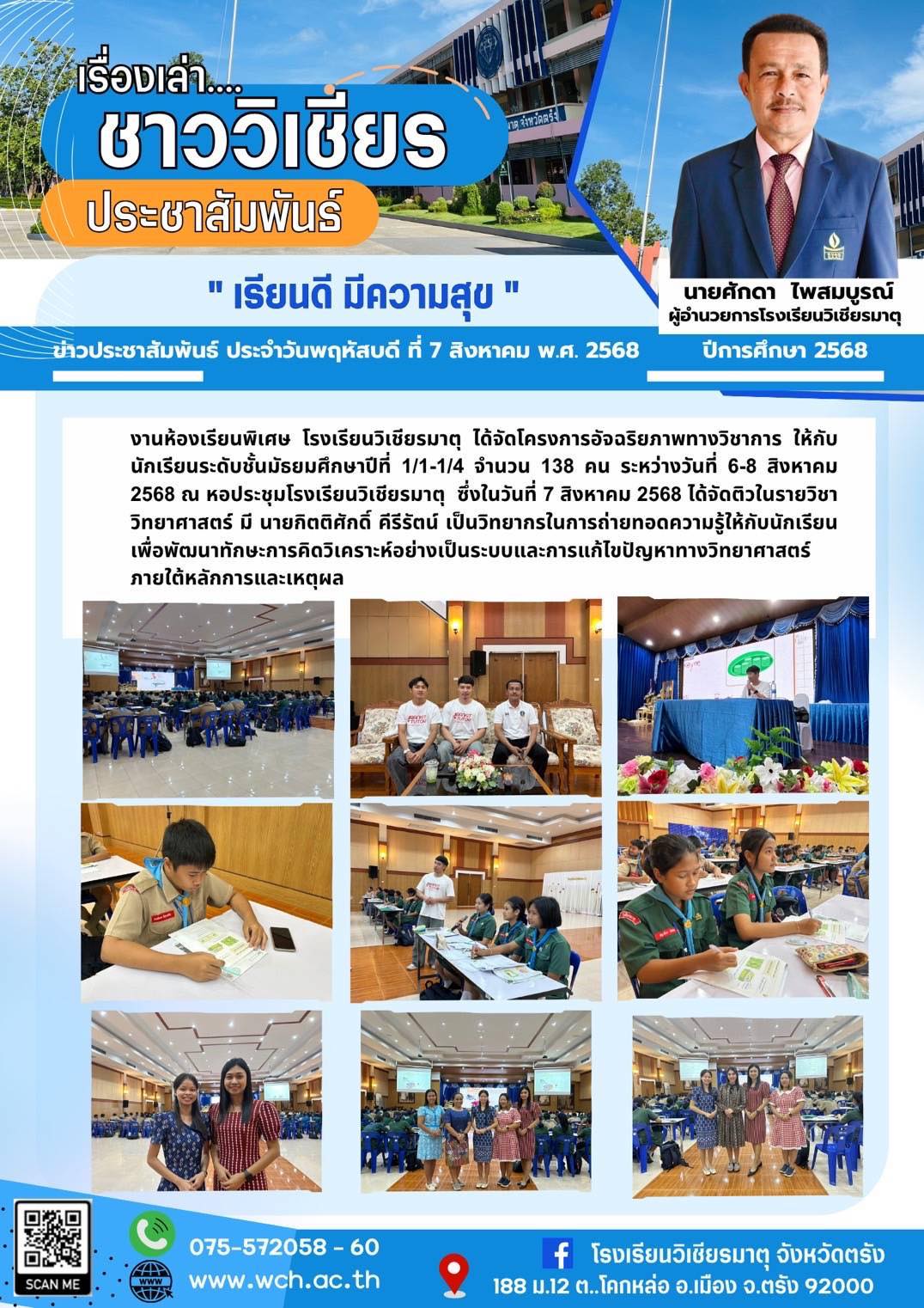 งานห้องเรียนพิเศษ โรงเรียนวิเชียรมาตุ ได้จัดโครงการอัจฉริยภาพทางวิชาการ ให้กับนักเรียนระดับชั้นมัธยมศึกษาปีที่ 1/1-1/4 จำนวน 138 คน ระหว่างวันที่ 6-8 สิงหาคม 2568 ณ หอประชุมโรงเรียนวิเชียรมาตุ วันที่ 7 สิงหาคม 2568 มี นายกิตติศักดิ์ คีรีรัตน์ เป็นวิทยากรในการถ่ายทอดความรู้ให้กับนักเรียนเพื่อพัฒนาทักษะการคิดวิเคราะห์อย่างเป็นระบบและการแก้ไขปัญหาทางวิทยาศาสตร์ภายใต้หลักการและเหตุผล