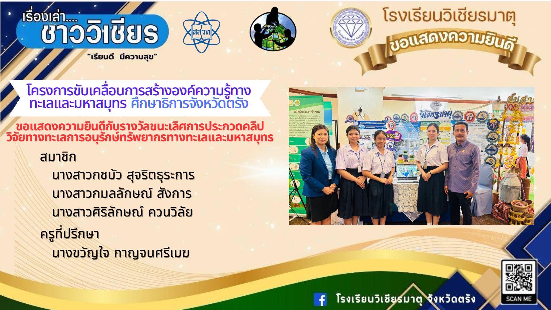 ขอแสดงความยินดี ได้รับรางวัลชนะเลิศการประกวดคลิป วิจัยทางทะเลการอนุรักษ์ทรัพยากรทางทะเลและมหาสมุทร โครงการขับเคลื่อนการสร้างองค์ความรู้ทาง ทะเลและมหาสมุทร ศึกษาธิการจังหวัดตรัง