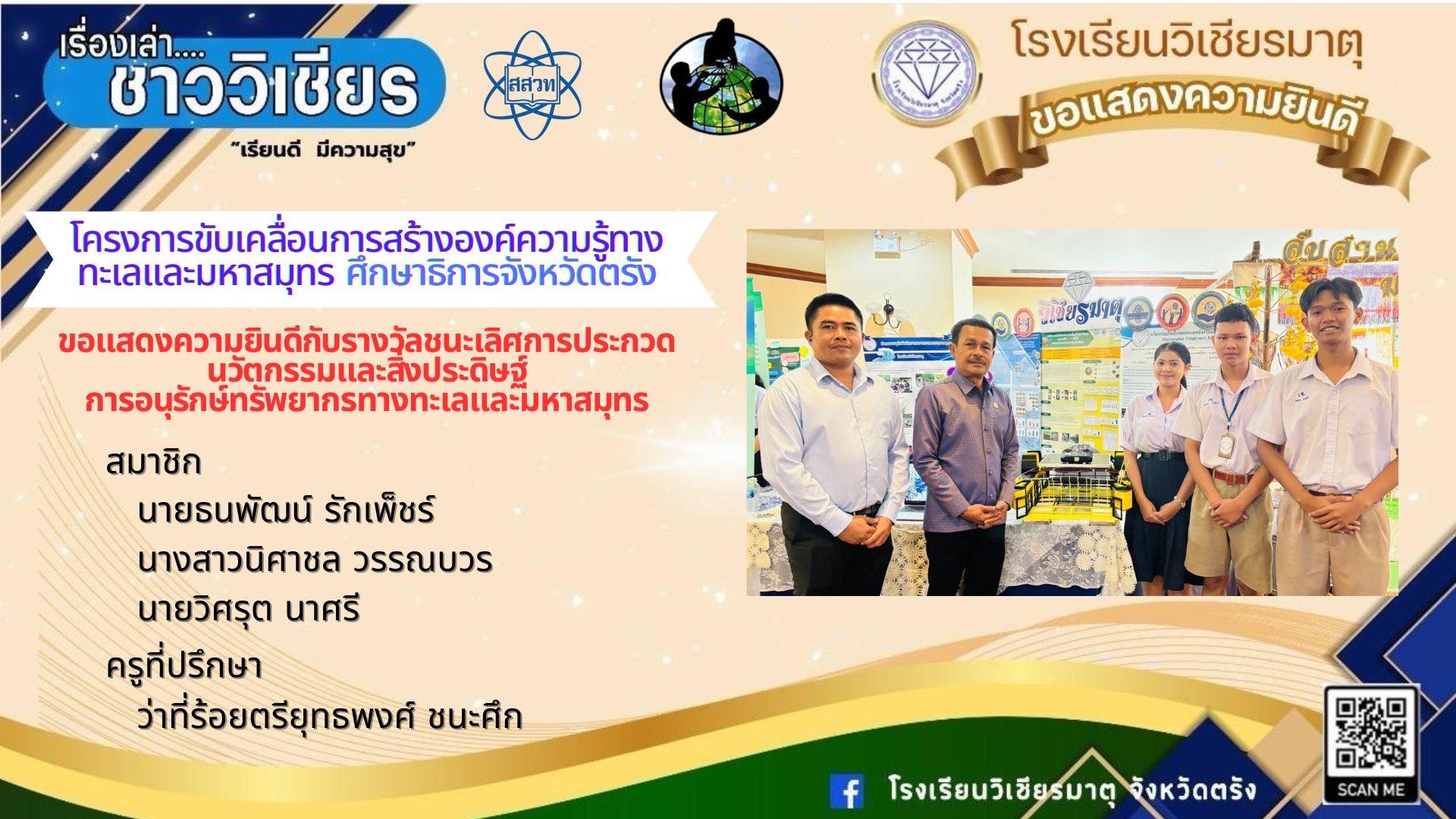 ขอแสดงความยินดี รางวัลชนะเลิศการประกวด นวัตกรรมและสิ่งประดิษฐ์ การอนุรักษ์ทรัพยากรทางทะเลและมหาสมุทร โครงการขับเคลื่อนการสร้างองค์ความรู้ทาง ทะเลและมหาสมุทร ศึกษาธิการจังหวัดตรัง
