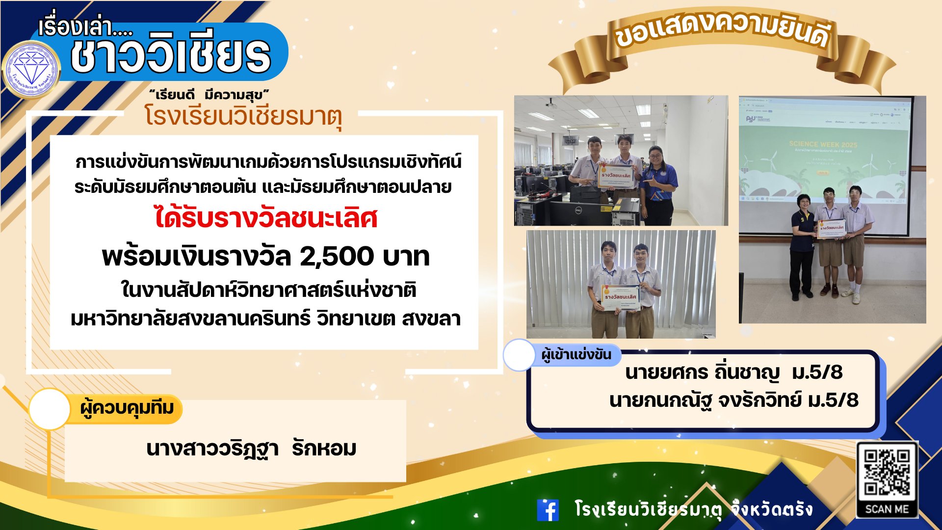 ขอแสดงความยินดี กับ การแข่งขันการพัฒนาเกมด้วยการโปรแกรมเชิงทัศน์ ระดับมัธยมศึกษาตอนต้น และมัธยมศึกษาตอนปลาย ได้รับรางวัลชนะเลิศ พร้อมเงินรางวัล 2,500 บาท