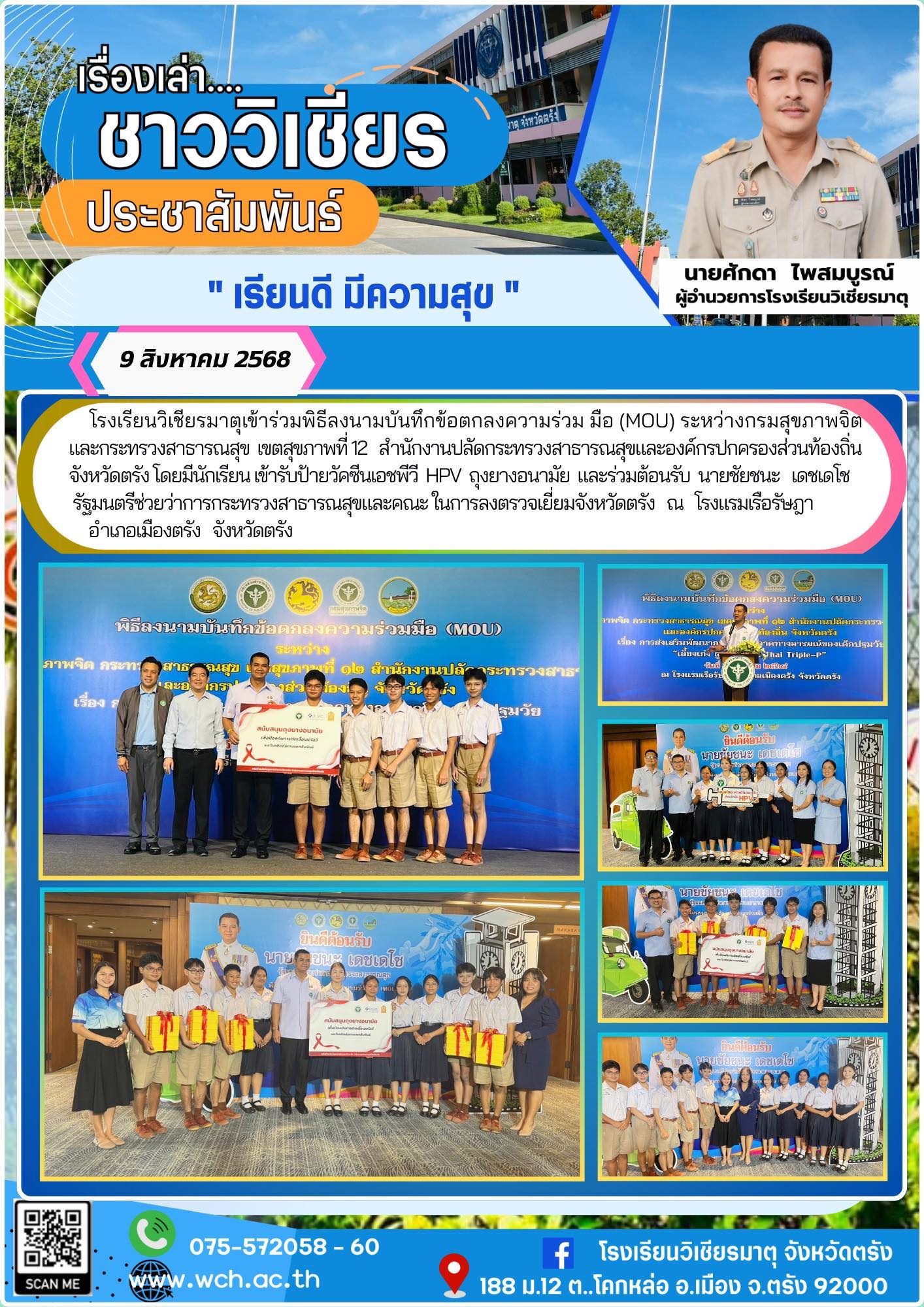 โรงเรียนวิเชียรมาตุเข้าร่วมพิธีลงนามบันทึกข้อตกลงความร่วมมือ (MOU) ระหว่างกรมสุขภาพจิตและกระทรวงสาธารณสุข เขตสุขภาพที่ 12 สำนักงานปลัดกระทรวงสาธารณสุขและองค์กรปกครองส่วนท้องถิ่นจังหวัดตรัง โดยมีนักเรียน เข้ารับป้ายวัคซีนเอชพีวี HPV ถุงยางอนามัย และร่วมต้อนรับ นายชัยชนะ เดชเดโช รัฐมนตรีช่วยว่าการกระทรวงสาธารณสุขและคณะ ในการลงตรวจเยี่ยมจังหวัดตรัง ณ โรงแรมเรือรัษฎา อำเภอเมืองตรัง จังหวัดตรัง
