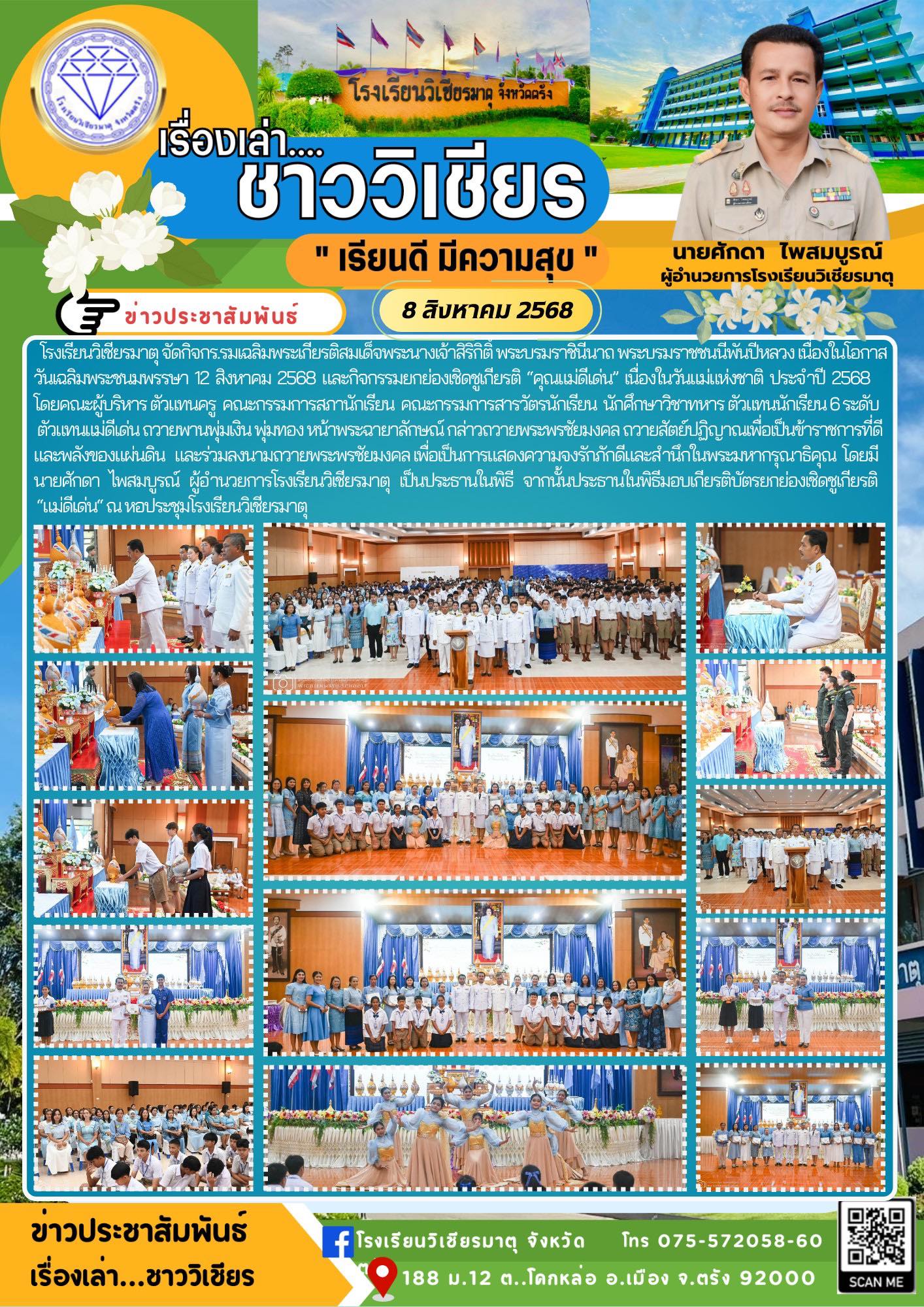 โรงเรียนวิเชียรมาตุ จัดกิจกรรมเฉลิมพระเกียรติสมเด็จพระนางเจ้าสิริกิติ์ พระบรมราชินีนาถ พระบรมราชชนนีพันปีหลวง เนื่องในโอกาสวันเฉลิมพระชนมพรรษา 12 สิงหาคม 2568 และกิจกรรมยกย่องเชิดชูเกียรติ “คุณแม่ดีเด่น” เนื่องในวันแม่แห่งชาติ ประจำปี 2568 โดยคณะผู้บริหาร ตัวแทนครู คณะกรรมการสภานักเรียน คณะกรรมการสารวัตรนักเรียน นักศึกษาวิชาทหาร ตัวแทนนักเรียน 6 ระดับ ตัวแทนแม่ดีเด่น ถวายพานพุ่มเงิน พุ่มทอง หน้าพระฉายาลักษณ์ กล่าวถวายพระพรชัยมงคล ถวายสัตย์ปฏิญาณเพื่อเป็นข้าราชการที่ดีและพลังของแผ่นดิน และร่วมลงนามถวายพระพรชัยมงคล เพื่อเป็นการแสดงความจงรักภักดีและสำนึกในพระมหากรุณาธิคุณ โดยมี นายศักดา ไพสมบูรณ์ ผู้อำนวยการโรงเรียนวิเชียรมาตุ เป็นประธานในพิธี จากนั้นประธานในพิธีมอบเกียรติบัตรยกย่องเชิดชูเกียรติ “แม่ดีเด่น“ ณ หอประชุมโรงเรียนวิเชียรมาตุ