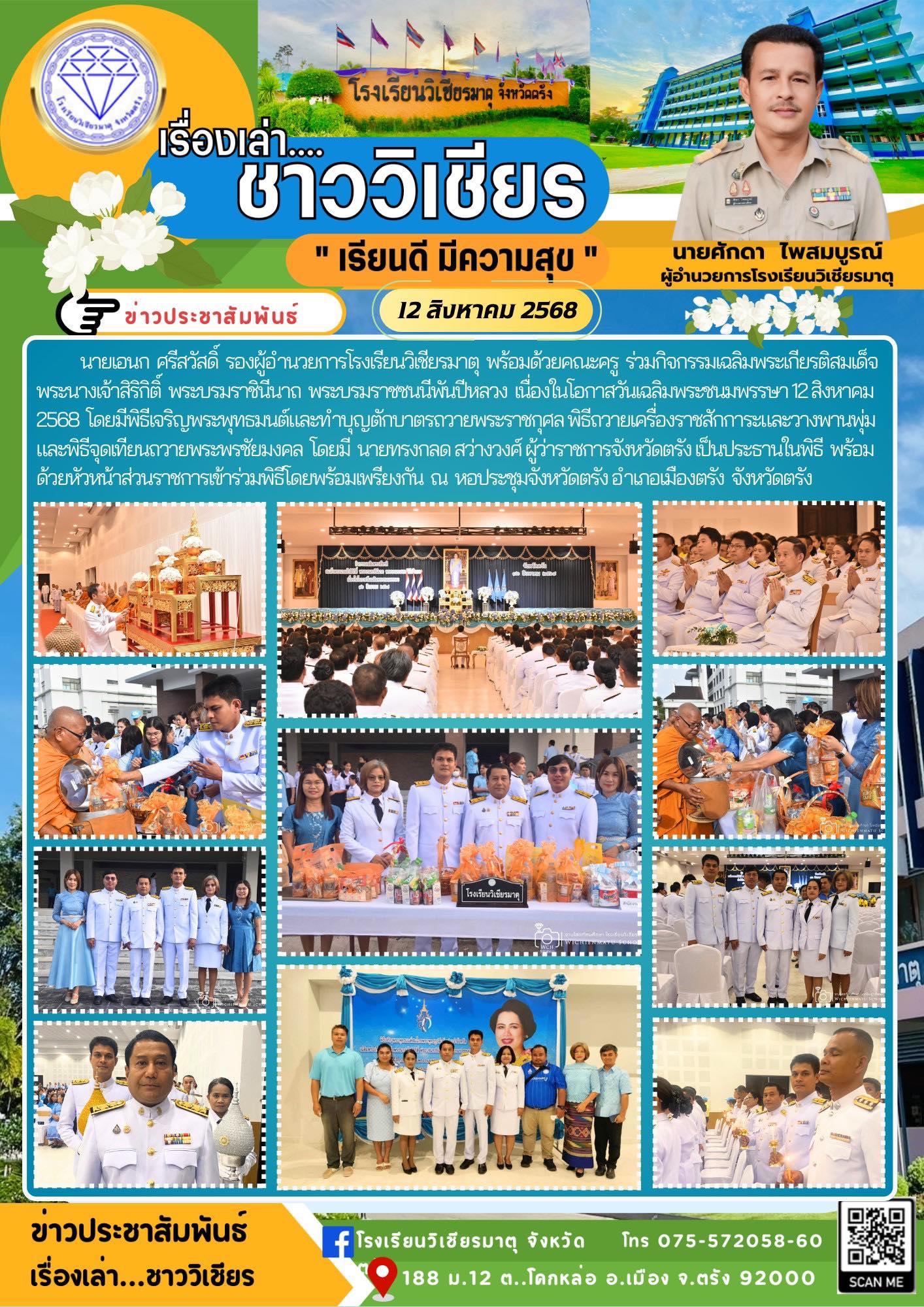 นายเอนก ศรีสวัสดิ์ รองผู้อำนวยการโรงเรียนวิเชียรมาตุ พร้อมด้วยคณะครู ร่วมกิจกรรมเฉลิมพระเกียรติสมเด็จพระนางเจ้าสิริกิติ์ พระบรมราชินีนาถ พระบรมราชชนนีพันปีหลวง เนื่องในโอกาสวันเฉลิมพระชนมพรรษา 12 สิงหาคม 2568 โดยมีพิธีเจริญพระพุทธมนต์และทำบุญตักบาตรถวายพระราชกุศล พิธีถวายเครื่องราชสักการะและวางพานพุ่ม และพิธีจุดเทียนถวายพระพรชัยมงคล โดยมี นายทรงกลด สว่างวงศ์ ผู้ว่าราชการจังหวัดตรัง เป็นประธานในพิธี พร้อมด้วยหัวหน้าส่วนราชการเข้าร่วมพิธีโดยพร้อมเพรียงกัน ณ หอประชุมจังหวัดตรัง อำเภอเมืองตรัง จังหวัดตรัง
