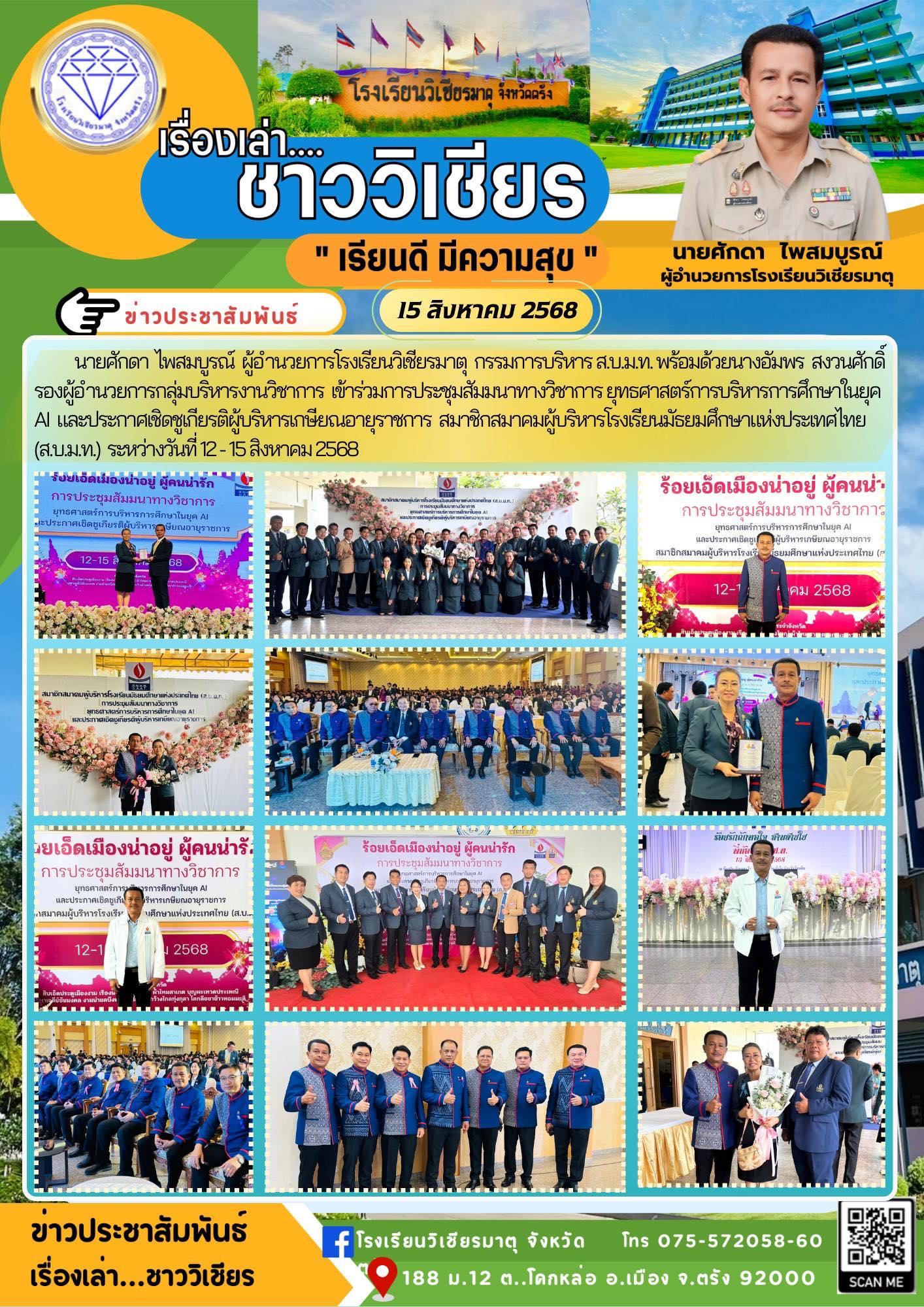 นายศักดา ไพสมบูรณ์ ผู้อำนวยการโรงเรียนวิเชียรมาตุ กรรมการบริหาร ส.บ.ม.ท. พร้อมด้วยนางอัมพร สงวนศักดิ์ รองผู้อำนวยการกลุ่มบริหารงานวิชาการ เข้าร่วมการประชุมสัมมนาทางวิชาการ ยุทธศาสตร์การบริหารการศึกษาในยุค AI และประกาศเชิดชูเกียรติผู้บริหารเกษียณอายุราชการ สมาชิกสมาคมผู้บริหารโรงเรียนมัธยมศึกษาแห่งประเทศไทย (ส.บ.ม.ท.) ระหว่างวันที่ 12-15 สิงหาคม 2568