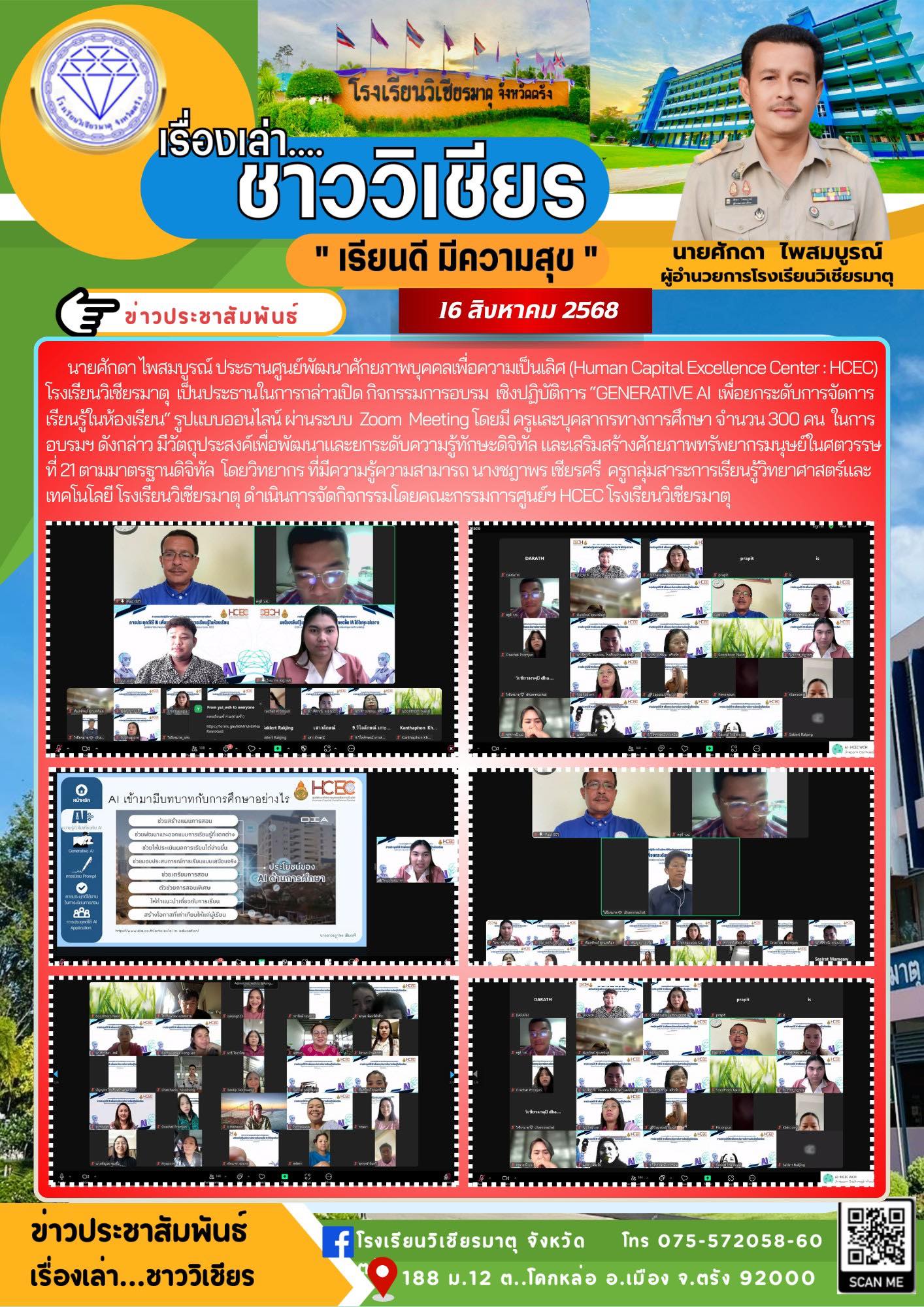 นายศักดา ไพสมบูรณ์ ประธานศูนย์พัฒนาศักยภาพบุคคลเพื่อความเป็นเลิศ (Human Capital Excellence Center : HCEC) โรงเรียนวิเชียรมาตุ เป็นประธานในการกล่าวเปิด กิจกรรมการอบรม เชิงปฏิบัติการ “GENERATIVE AI เพื่อยกระดับการจัดการเรียนรู้ในห้องเรียน“ รูปแบบออนไลน์ ผ่านระบบ Zoom Meeting โดยมี ครูและบุคลากรทางการศึกษา จำนวน 300 คน ในการอบรมฯ ดังกล่าว มีวัตถุประสงค์เพื่อพัฒนาและยกระดับความรู้ทักษะดิจิทัล และเสริมสร้างศักยภาพทรัพยากรมนุษย์ในศตวรรษที่ 21 ตามมาตรฐานดิจิทัล โดยวิทยากร ที่มีความรู้ความสามารถ นางชฎาพร เชียรศรี ครูกลุ่มสาระการเรียนรู้วิทยาศาสตร์และเทคโนโลยี โรงเรียนวิเชียรมาตุ ดำเนินการจัดกิจกรรมโดยคณะกรรมการศูนย์ฯ HCEC โรงเรียนวิเชียรมาตุ