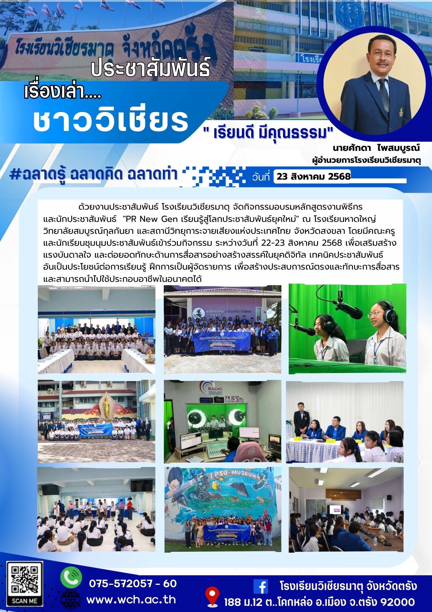 ด้วยงานประชาสัมพันธ์ โรงเรียนวิเชียรมาตุ จัดกิจกรรมอบรมหลักสูตรงานพิธีกร และนักประชาสัมพันธ์ “PR New Gen เรียนรู้สู่โลกประชาสัมพันธ์ยุคใหม่” ณ โรงเรียนหาดใหญ่วิทยาลัยสมบูรณ์กุลกันยา และสถานีวิทยุการะจายเสียงแห่งประเทศไทย จังหวัดสงขลา โดยมีคณะครูและนักเรียนชุมนุมประชาสัมพันธ์เข้าร่วมกิจกรรม ระหว่างวันที่ 22-23 สิงหาคม 2568 เพื่อเสริมสร้างแรงบันดาลใจ และต่อยอดทักษะด้านการสื่อสารอย่างสร้างสรรค์ในยุคดิจิทัล เทคนิคประชาสัมพันธ์