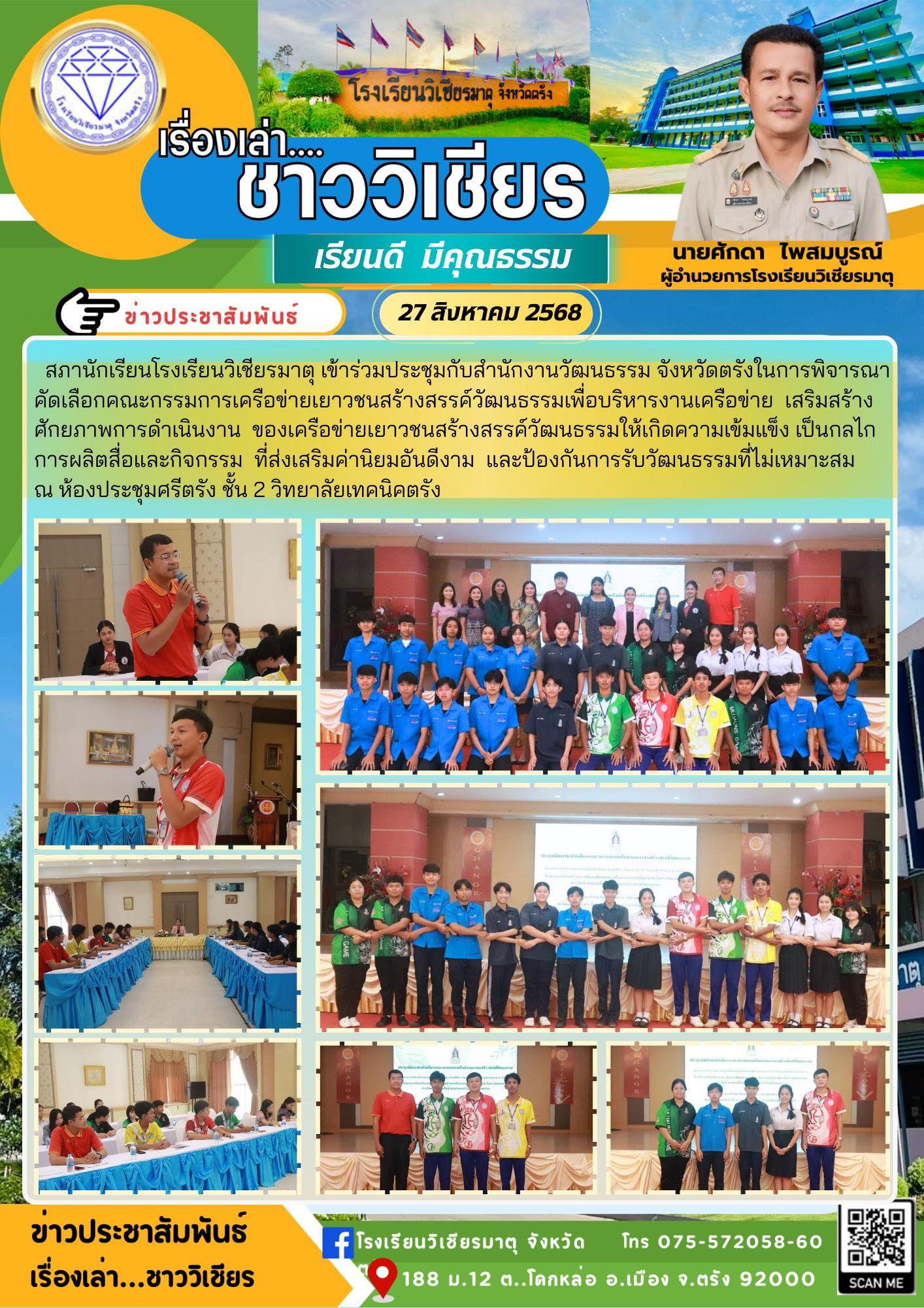 สภานักเรียนโรงเรียนวิเชียรมาตุ เข้าร่วมประชุมกับสำนักงานวัฒนธรรม จังหวัดตรังในการพิจารณาคัดเลือกคณะกรรมการเครือข่ายเยาวชนสร้างสรรค์วัฒนธรรมเพื่อบริหารงานเครือข่าย เสริมสร้างศักยภาพการดำเนินงาน ของเครือข่ายเยาวชนสร้างสรรค์วัฒนธรรมให้เกิดความเข้มแข็ง เป็นกลไกการผลิตสื่อและกิจกรรม ที่ส่งเสริมค่านิยมอันดีงาม และป้องกันการรับวัฒนธรรมที่ไม่เหมาะสม ณ ห้องประชุมศรีตรัง ชั้น 2 วิทยาลัยเทคนิคตรัง