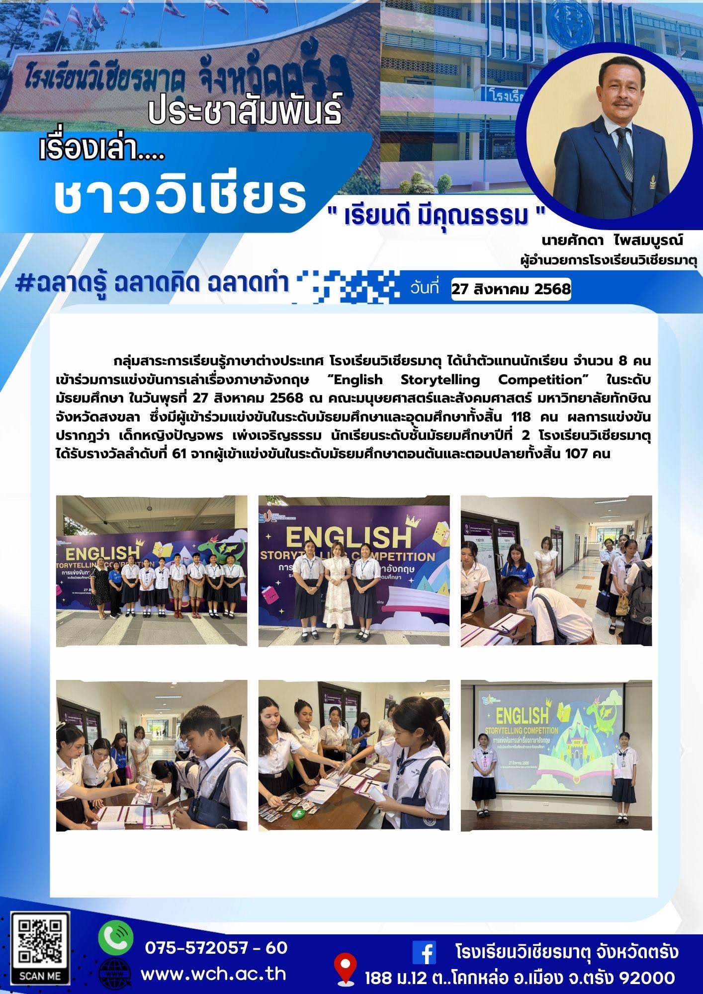 กลุ่มสาระการเรียนรู้ภาษาต่างประเทศ โรงเรียนวิเชียรมาตุ ได้นำตัวแทนนักเรียน จำนวน 8 คน เข้าร่วมการแข่งขันการเล่าเรื่องภาษาอังกฤษ “English Storytelling Competition” ในระดับมัธยมศึกษา ในวันพุธที่ 27 สิงหาคม 2568 ณ คณะมนุษยศาสตร์และสังคมศาสตร์ มหาวิทยาลัยทักษิณ จังหวัดสงขลา ซึ่งมีผู้เข้าร่วมแข่งขันในระดับมัธยมศึกษาและอุดมศึกษาทั้งสิ้น 118 คน ผลการแข่งขันปรากฎว่า เด็กหญิงปัญจพร เพ่งเจริญธรรม นักเรียนระดับชั้นมัธยมศึกษาปีที่ 2 โรงเรียนวิเชียรมาตุ ได้รับรางวัลลำดับที่ 61 จากผู้เข้าแข่งขันในระดับมัธยมศึกษาตอนต้นและตอนปลายทั้งสิ้น 107 คน