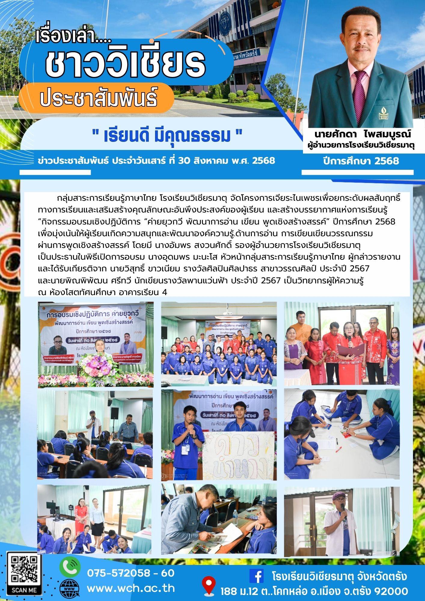 กลุ่มสาระการเรียนรู้ภาษาไทย โรงเรียนวิเชียรมาตุ จัดโครงการเจียระไนเพชรเพื่อยกระดับผลสัมฤทธิ์ทางการเรียนและเสริมสร้างคุณลักษณะอันพึงประสงค์ของผู้เรียน และสร้างบรรยากาศแห่งการเรียนรู้ “กิจกรรมอบรมเชิงปฏิบัติการ “ค่ายยุวกวี พัฒนาการอ่าน เขียน พูดเชิงสร้างสรรค์” ปีการศึกษา 2568 เพื่อมุ่งเน้นให้ผู้เรียนเกิดความสนุกและพัฒนาองค์ความรู้.ด้านการอ่าน การเขียนเขียนวรรณกรรม ผ่านการพูดเชิงสร้างสรรค์ โดยมี นางอัมพร สงวนศักดิ์ รองผู้อำนวยการโรงเรียนวิเชียรมาตุ เป็นประธานในพิธีเปิดการอบรม นางอุดมพร มะนะโส หัวหน้ากลุ่มสาระการเรียนรู้ภาษาไทย ผู้กล่าวรายงาน และได้รับเกียรติจาก นายวิสุทธิ์ ขาวเนียม รางวัลศิลปินศิลปาธร สาขาวรรณศิลป์ ประจำปี 2567 และนายพิณพิพัฒน ศรีทวี นักเขียนรางวัลพานแว่นฟ้า ประจำปี 2567 เป็นวิทยากรผู้ให้ความรู้ ณ ห้องโสตทัศนศึกษา อาคารเรียน 4