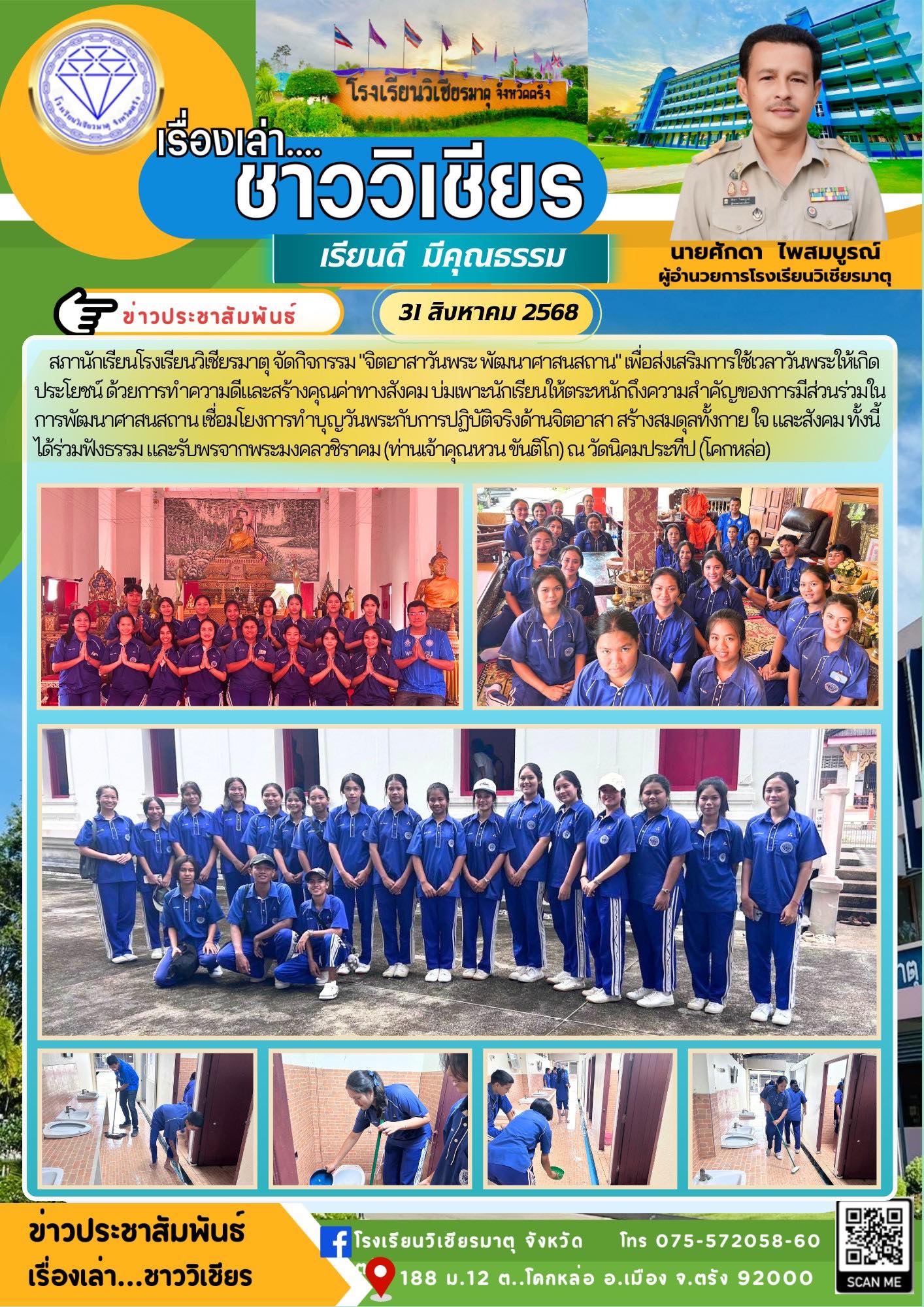 สภานักเรียนโรงเรียนวิเชียรมาตุ จัดกิจกรรม “จิตอาสาวันพระ พัฒนาศาสนสถาน” เพื่อส่งเสริมการใช้เวลาวันพระให้เกิดประโยชน์ ด้วยการทำความดีและสร้างคุณค่าทางสังคม บ่มเพาะนักเรียนให้ตระหนักถึงความสำคัญของการมีส่วนร่วมในการพัฒนาศาสนสถาน เชื่อมโยงการทำบุญวันพระกับการปฏิบัติจริงด้านจิตอาสา สร้างสมดุลทั้งกาย ใจ และสังคม ทั้งนี้ได้ร่วมฟังธรรม และรับพรจากพระมงคลวชิราคม (ท่านเจ้าคุณหวน ขันติโก) ณ วัดนิคมประทีป(โคกหล่อ)