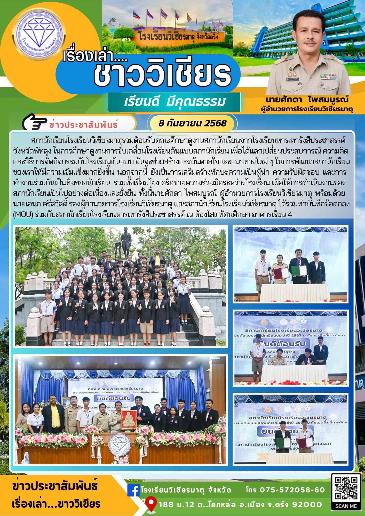 สภานักเรียนโรงเรียนวิเชียรมาตุร่วมต้อนรับคณะศึกษาดูงานสภานักเรียนจากโรงเรียนหารเทารังสีประชาสรรค์ จังหวัดพัทลุง ในการศึกษาดูงานการขับเคลื่อนโรงเรียนต้นแบบสภานักเรียน เพื่อได้แลกเปลี่ยนประสบการณ์ ความคิด และวิธีการจัดกิจกรรมกับโรงเรียนต้นแบบ อันจะช่วยสร้างแรงบันดาลใจและแนวทางใหม่ ๆ ในการพัฒนาสภานักเรียนของเราให้มีความเข้มแข็งมากยิ่งขึ้น นอกจากนี้ ยังเป็นการเสริมสร้างทักษะความเป็นผู้นำ ความรับผิดชอบ และการทำงานร่วมกันเป็นทีมของนักเรียน รวมทั้งเชื่อมโยงเครือข่ายความร่วมมือระหว่างโรงเรียน เพื่อให้การดำเนินงานของสภานักเรียนเป็นไปอย่างต่อเนื่องและยั่งยืน ทั้งนี้นายศักดา ไพสมบูรณ์ ผู้อำนวยการโรงเรียนวิเชียรมาตุ พร้อมด้วยนายเอนก ศรีสวัสดิ์ รองผู้อำนวยการโรงเรียนวิเชียรมาตุ และสภานักเรียนโรงเรียนวิเชียรมาตุ ได้ร่วมทำบันทึกข้อตกลง (MOU) ร่วมกับสภานักเรียนโรงเรียนหารเทารังสีประชาสรรค์ ณ ห้องโสตทัศนศึกษา อาคารเรียน 4