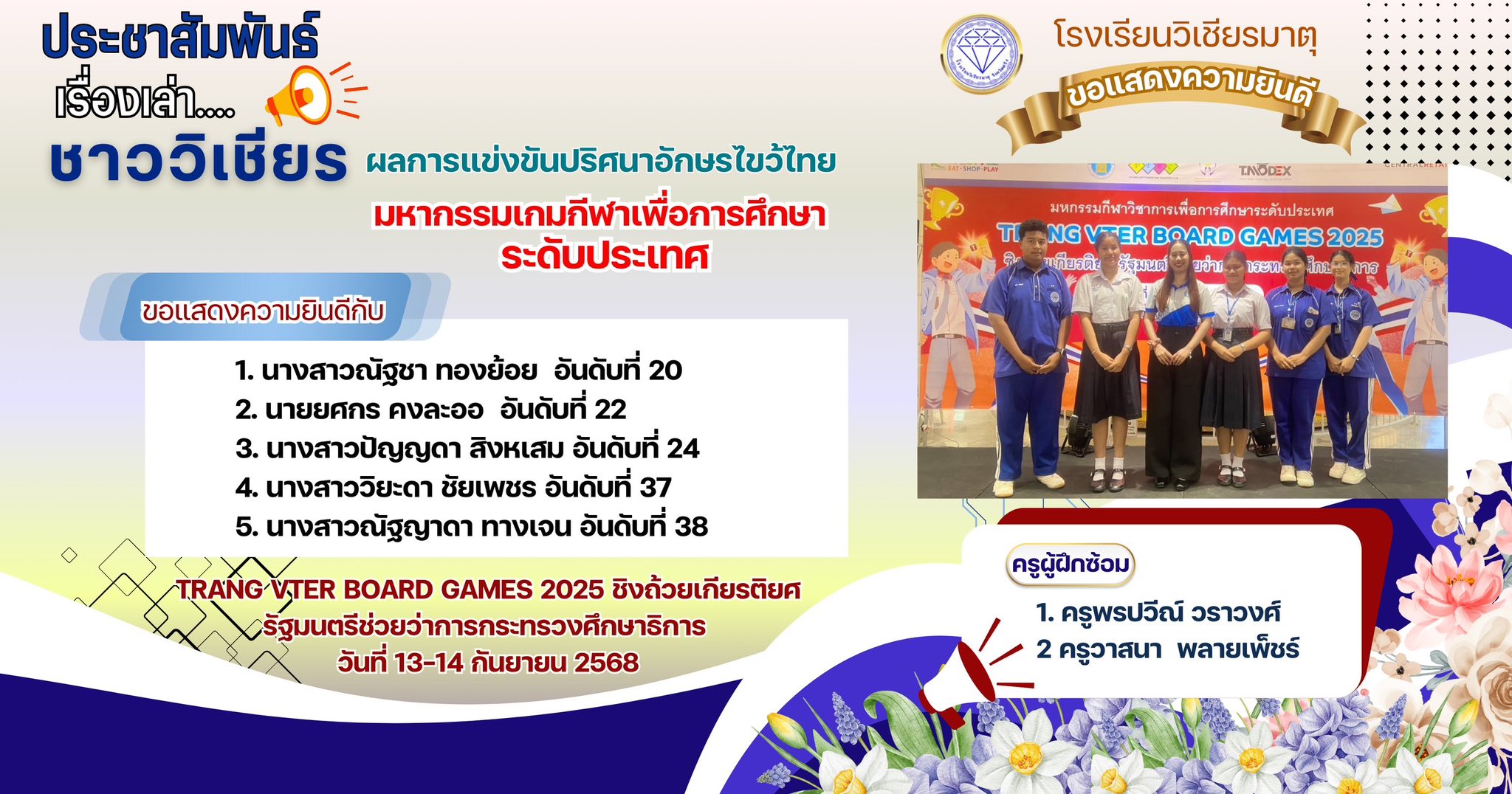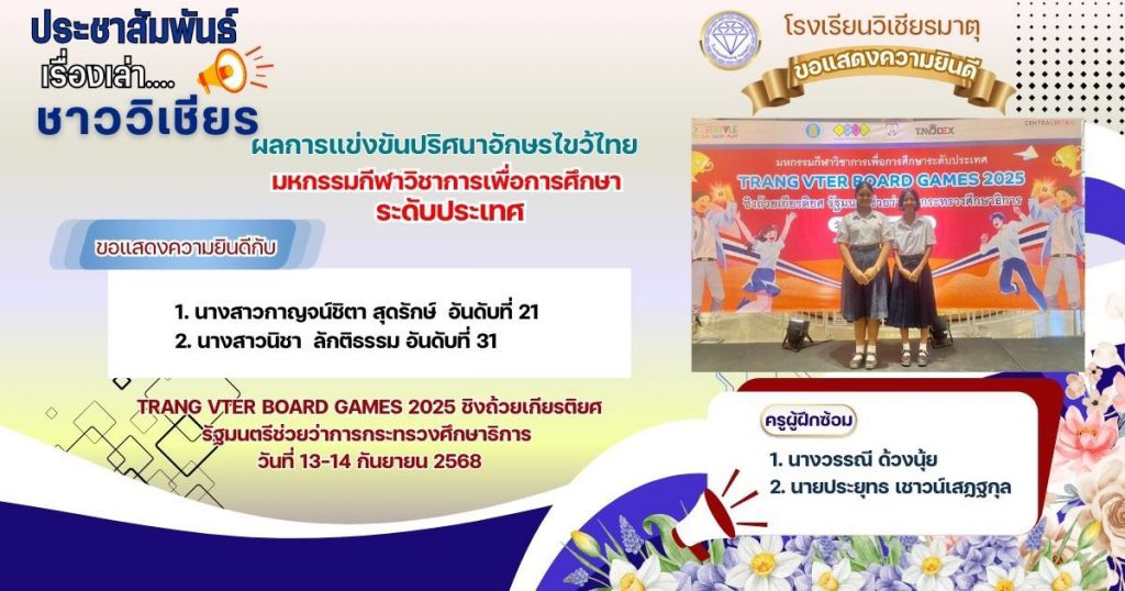 กลุ่มสาระการเรียนรู้ภาษาไทย โรงเรียนวิเชียรมาตุ ได้นำตัวแทนนักเรียน จำนวน 7 คน เข้าร่วมการแข่งขันปริศนาอักษรไขว้ไทย รุ่นโอเพ่น ระดับประเทศ ในวันที่ 13-14 กันยายน 2568 ณ ศูนย์การค้าโรบินสันไลฟ์สไตล์ ตรัง จังหวัดตรัง