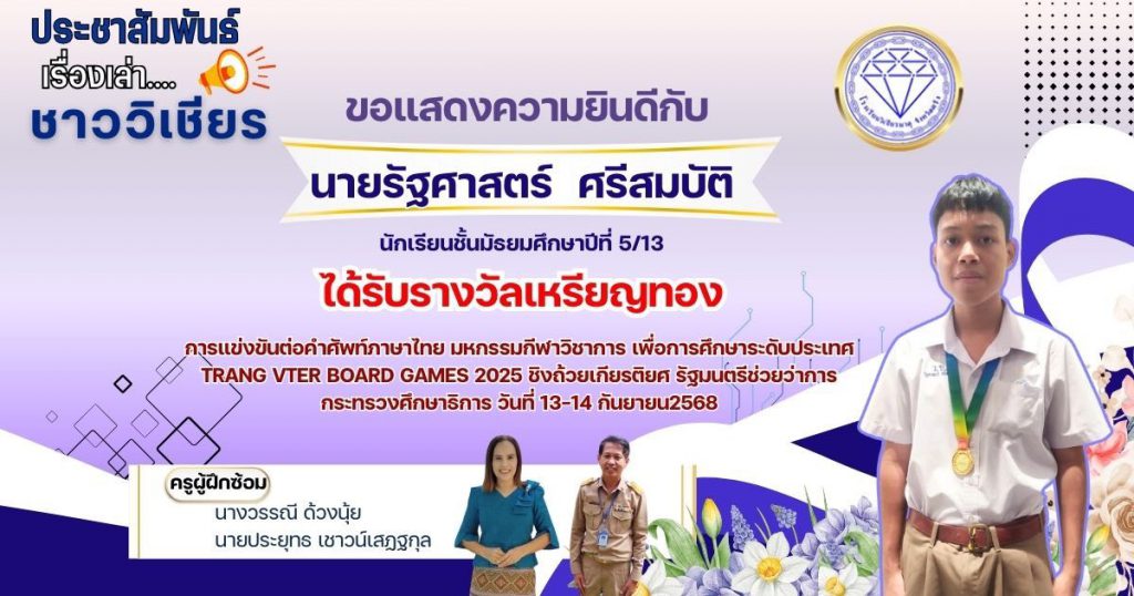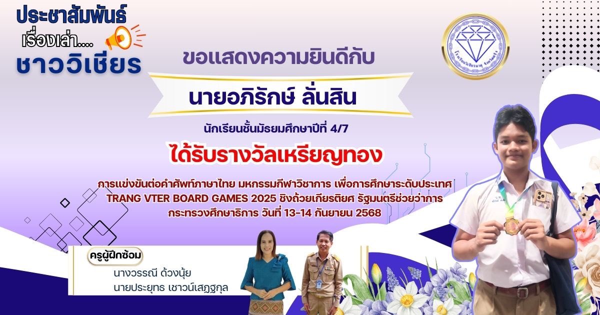 ได้รับรางวัลเหรียญทอง การแข่งขันต่อคำศัพท์ภาษาไทย มหกรรมกีฬาวิชาการเพื่อการศึกษาระดับประเทศ TRANG VTER BOARD GAMES 2025 ชิงถ้วยเกียรติยศ รัฐมนตรีช่วยว่าการกระทรวงศึกษาธิการ วันที่ 13-14 กันยายน 2568