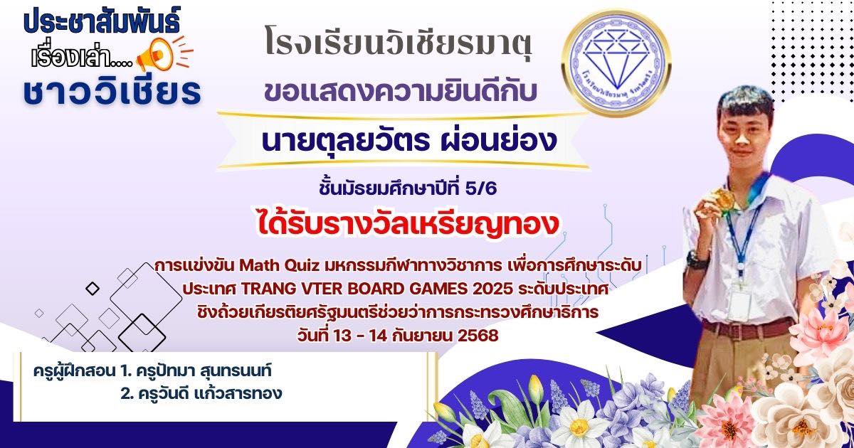 ขอแสดงความยินดีกับ นายดุลยวัตร ผ่อนย่อง ม.5/6 ได้รับรางวัลเหรียญทอง การแข่งขัน Math Quiz มหกรรมกีฬาวิชาการเพื่อการศึกษาระดับประเทศ TRANG VTER BOARD GAMES 2025 ชิงถ้วยเกียรติยศ รัฐมนตรีช่วยว่าการกระทรวงศึกษาธิการ วันที่ 13-14 กันยายน 2568