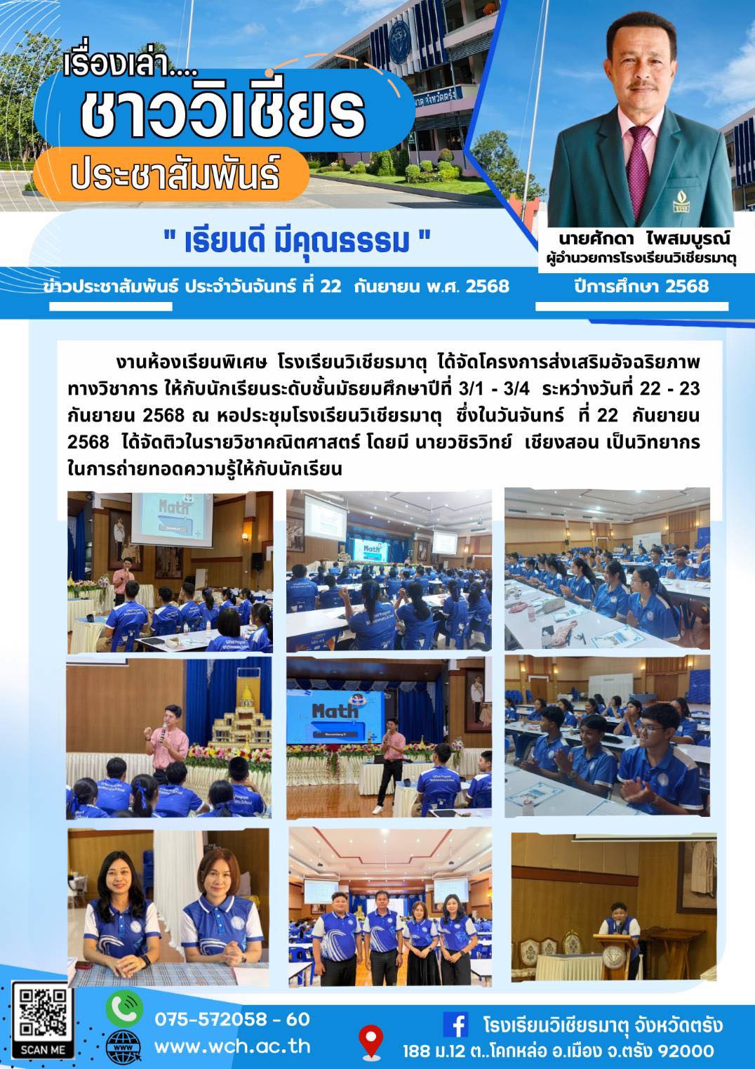 งานห้องเรียนพิเศษ โรงเรียนวิเชียรมาตุ ได้จัดโครงการส่งเสริมอัจฉริยภาพทางวิชาการ ให้กับนักเรียนระดับชั้นมัธยมศึกษาปีที่ 3/1 – 3/4 ระหว่างวันที่ 22 – 23 กันยายน 2568 ณ หอประชุมโรงเรียนวิเชียรมาตุ ซึ่งในวันจันทร์ ที่ 22 กันยายน 2568 ได้จัดติวในรายวิชาคณิตศาสตร์ โดยมี นายวชิรวิทย์ เชียงสอน เป็นวิทยากรในการถ่ายทอดความรู้ให้กับนักเรียน