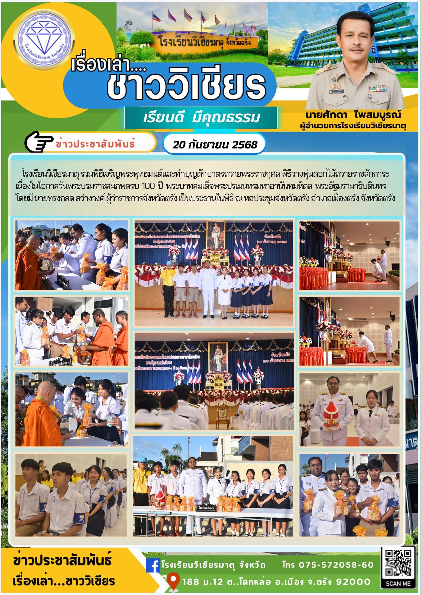 โรงเรียนวิเชียรมาตุ ร่วมพิธีเจริญพระพุทธมนต์และทำบุญตักบาตรถวายพระราชกุศล พิธีวางพุ่มดอกไม้ถวายราชสักการะ เนื่องในโอกาสวันพระบรมราชสมภพครบ 100 ปี พระบาทสมเด็จพระปรเมนทรมหาอานันทมหิดล พระอัฐมรามาธิบดินทร โดยมี นายทรงกลด สว่างวงศ์ ผู้ว่าราชการจังหวัดตรัง เป็นประธานในพิธี ณ หอประชุมจังหวัดตรัง อำเภอเมืองตรัง จังหวัดตรัง