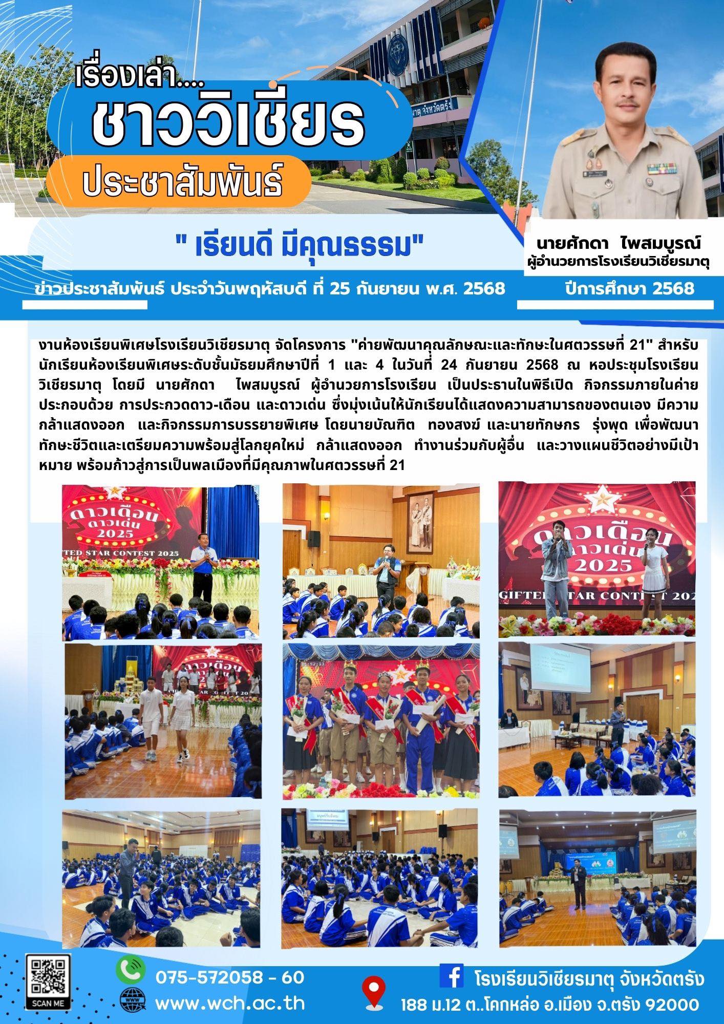 งานห้องเรียนพิเศษโรงเรียนวิเชียรมาตุ จัดโครงการ “ค่ายพัฒนาคุณลักษณะและทักษะในศตวรรษที่ 21” สำหรับนักเรียนห้องเรียนพิเศษระดับชั้นมัธยมศึกษาปีที่ 1 และ 4 ในวันที่ 24 กันยายน 2568 ณ หอประชุมโรงเรียนวิเชียรมาตุ โดยมี นายศักดา ไพสมบูรณ์ ผู้อำนวยการโรงเรียน เป็นประธานในพิธีเปิด กิจกรรมภายในค่ายประกอบด้วย การประกวดดาว-เดือน และดาวเด่น ซึ่งมุ่งเน้นให้นักเรียนได้แสดงความสามารถของตนเอง มีความกล้าแสดงออก และกิจกรรมการบรรยายพิเศษ โดยนายบัณฑิต ทองสงฆ์ และนายทักษกร รุ่งพุด เพื่อพัฒนาทักษะชีวิตและเตรียมความพร้อมสู่โลกยุคใหม่ กล้าแสดงออก ทำงานร่วมกับผู้อื่น และวางแผนชีวิตอย่างมีเป้าหมาย พร้อมก้าวสู่การเป็นพลเมืองที่มีคุณภาพในศตวรรษที่ 21