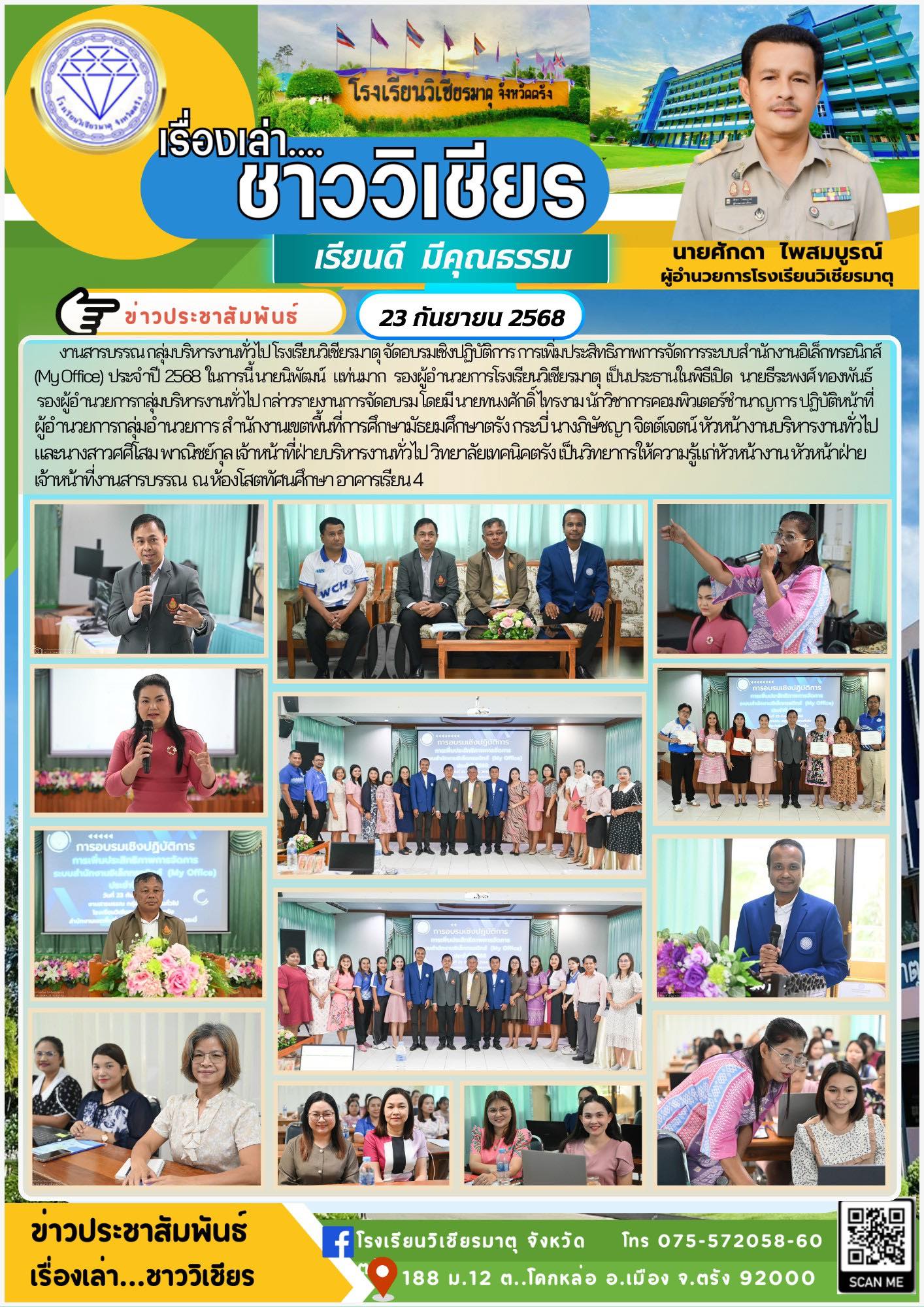 งานสารบรรณ กลุ่มบริหารงานทั่วไป โรงเรียนวิเชียรมาตุ จัดอบรมเชิงปฏิบัติการ การเพิ่มประสิทธิภาพการจัดการระบบสำนักงานอิเล็กทรอนิกส์ (My Office) ประจำปี 2568 ในการนี้ นายนิพัฒน์ แท่นมาก รองผู้อำนวยการโรงเรียนวิเชียรมาตุ เป็นประธานในพิธีเปิด นายธีระพงศ์ ทองพันธ์ รองผู้อำนวยการกลุ่มบริหารงานทั่วไป กล่าวรายงานการจัดอบรม โดยมี นายทนงศักดิ์ ไทรงาม นักวิชาการคอมพิวเตอร์ชำนาญการ ปฏิบัติหน้าที่ผู้อำนวยการกลุ่มอำนวยการ สำนักงานเขตพื้นที่การศึกษามัธยมศึกษาตรัง กระบี่ นางภิษัชญา จิตต์เจตน์ หัวหน้างานบริหารงานทั่วไป และนางสาวศศิโสม พาณิชย์กุล เจ้าหน้าที่ฝ่ายบริหารงานทั่วไป วิทยาลัยเทคนิคตรัง เป็นวิทยากรให้ความรู้แก่หัวหน้างาน หัวหน้าฝ่าย เจ้าหน้าที่งานสารบรรณ ณ ห้องโสตทัศนศึกษา อาคารเรียน 4