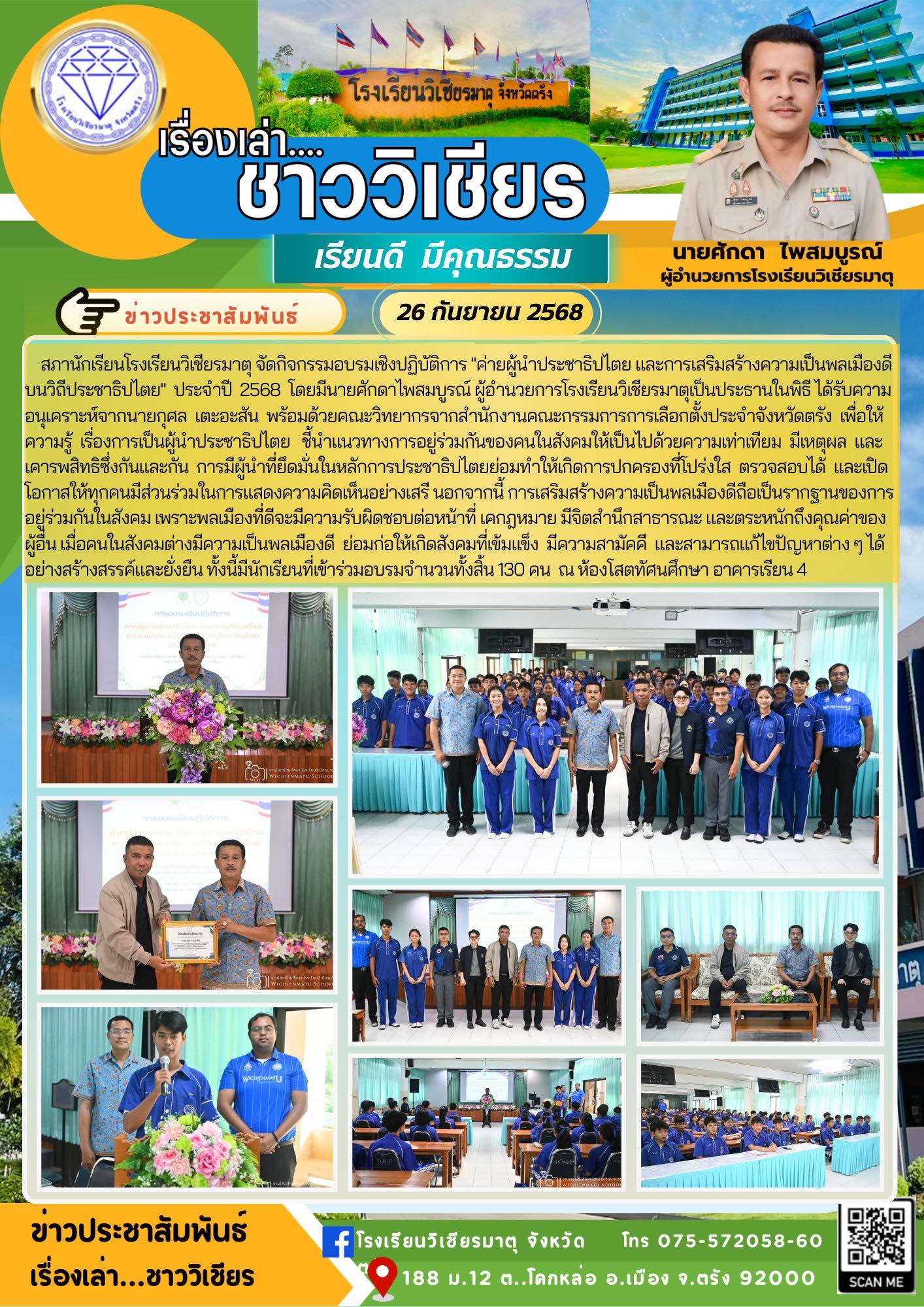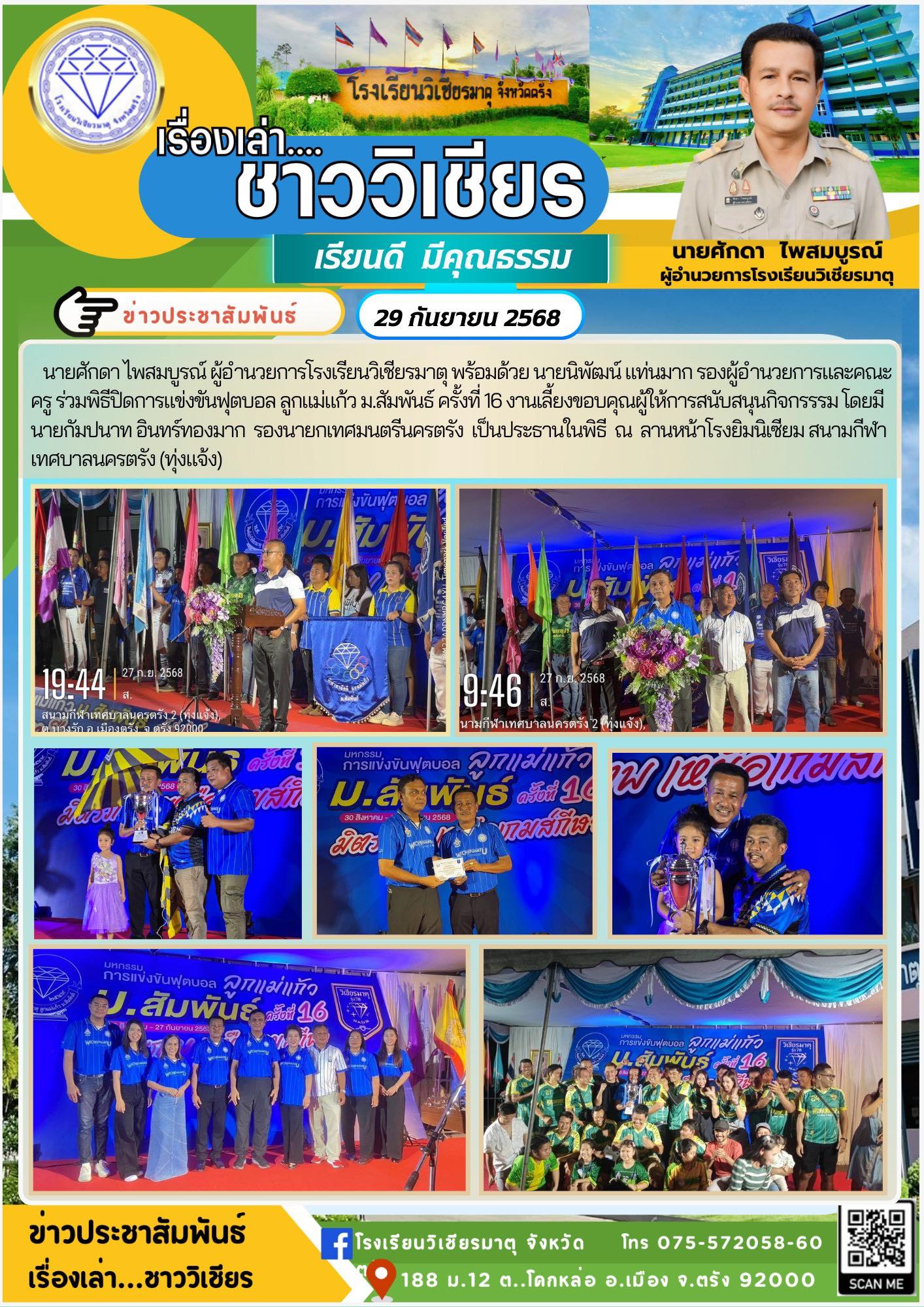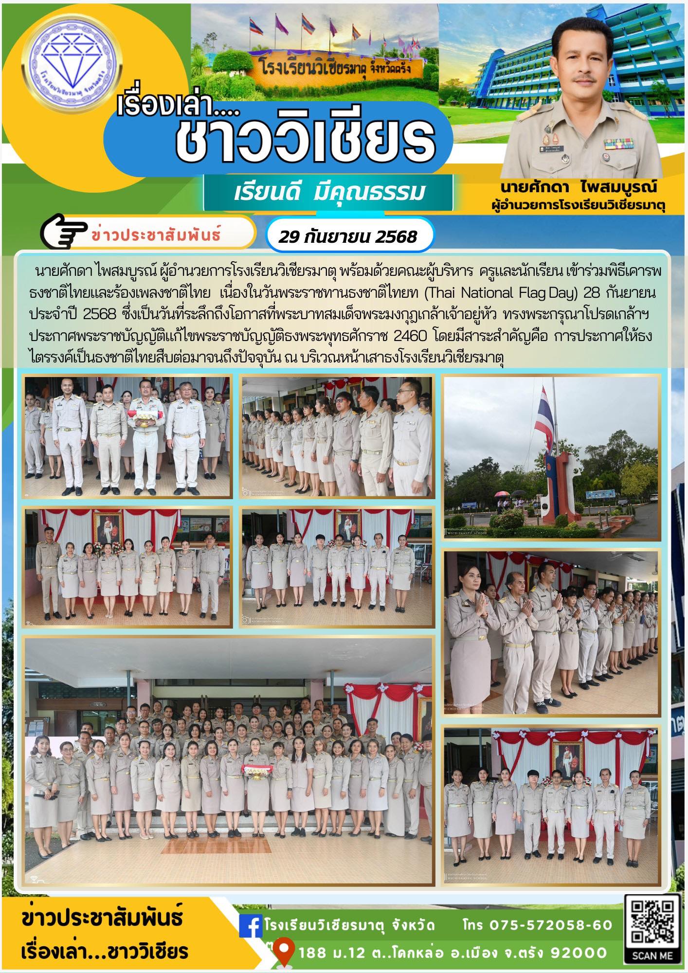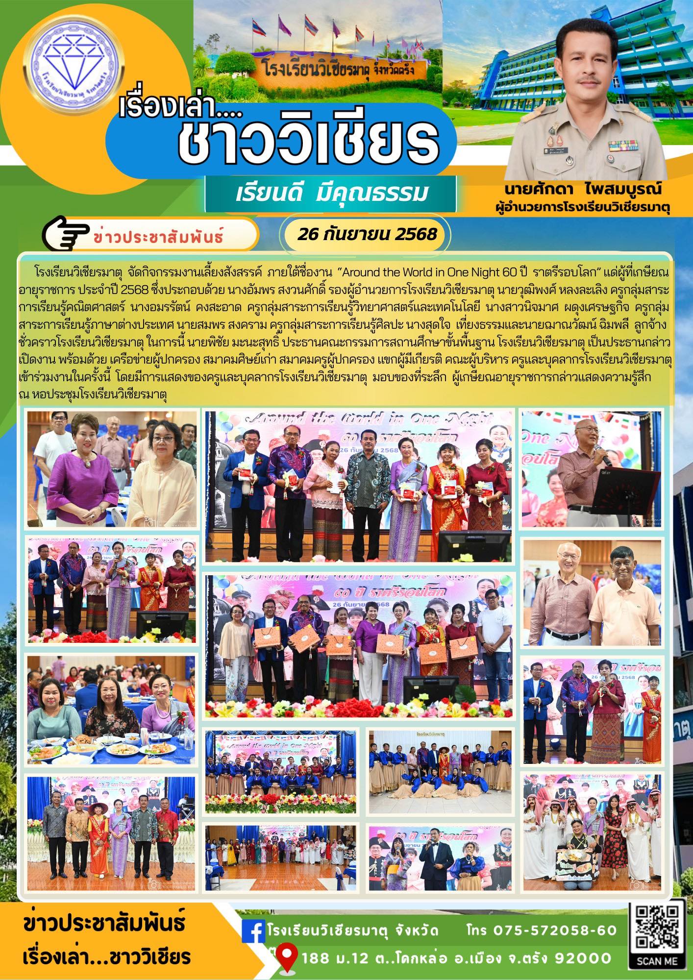 โรงเรียนวิเชียรมาตุ จัดกิจกรรมงานเลี้ยงสังสรรค์ ภายใต้ชื่องาน “Around the World in One Night 60 ปี ราตรีรอบโลก” แด่ผู้ที่เกษียณอายุราชการ ประจำปี 2568 ซึ่งประกอบด้วย นางอัมพร สงวนศักดิ์ รองผู้อำนวยการโรงเรียนวิเชียรมาตุ นายวุฒิพงศ์ หลงละเลิง ครูกลุ่มสาระการเรียนรู้คณิตศาสตร์ นางอมรรัตน์ คงสะอาด ครูกลุ่มสาระการเรียนรู้วิทยาศาสตร์และเทคโนโลยี นางสาวนิจมาศ ผดุงเศรษฐกิจ ครูกลุ่มสาระการเรียนรู้ภาษาต่างประเทศ นายสมพร สงคราม ครูกลุ่มสาระการเรียนรู้ศิลปะ นางสุดใจ เที่ยงธรรมและนายฌาณวัฒน์ ฉิมพลี ลูกจ้างชั่วคราวโรงเรียนวิเชียรมาตุ ในการนี้ นายพิชัย มะนะสุทธิ์ ประธานคณะกรรมการสถานศึกษาขั้นพื้นฐาน โรงเรียนวิเชียรมาตุ เป็นประธานกล่าวเปิดงาน พร้อมด้วย เครือข่ายผู้ปกครอง สมาคมศิษย์เก่า สมาคมครูผู้ปกครอง แขกผู้มีเกียรติ คณะผู้บริหาร ครูและบุคลากรโรงเรียนวิเชียรมาตุ เข้าร่วมงานในครั้งนี้ โดยมีการแสดงของครูและบุคลากรโรงเรียนวิเชียรมาตุ มอบของที่ระลึก ผู้เกษียณอายุราชการกล่าวแสดงความรู้สึก ณ หอประชุมโรงเรียนวิเชียรมาตุ