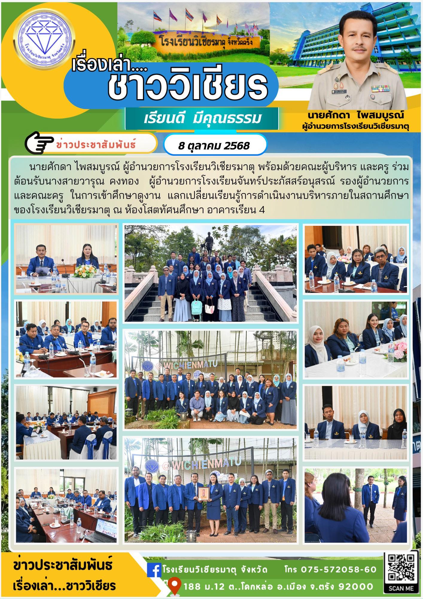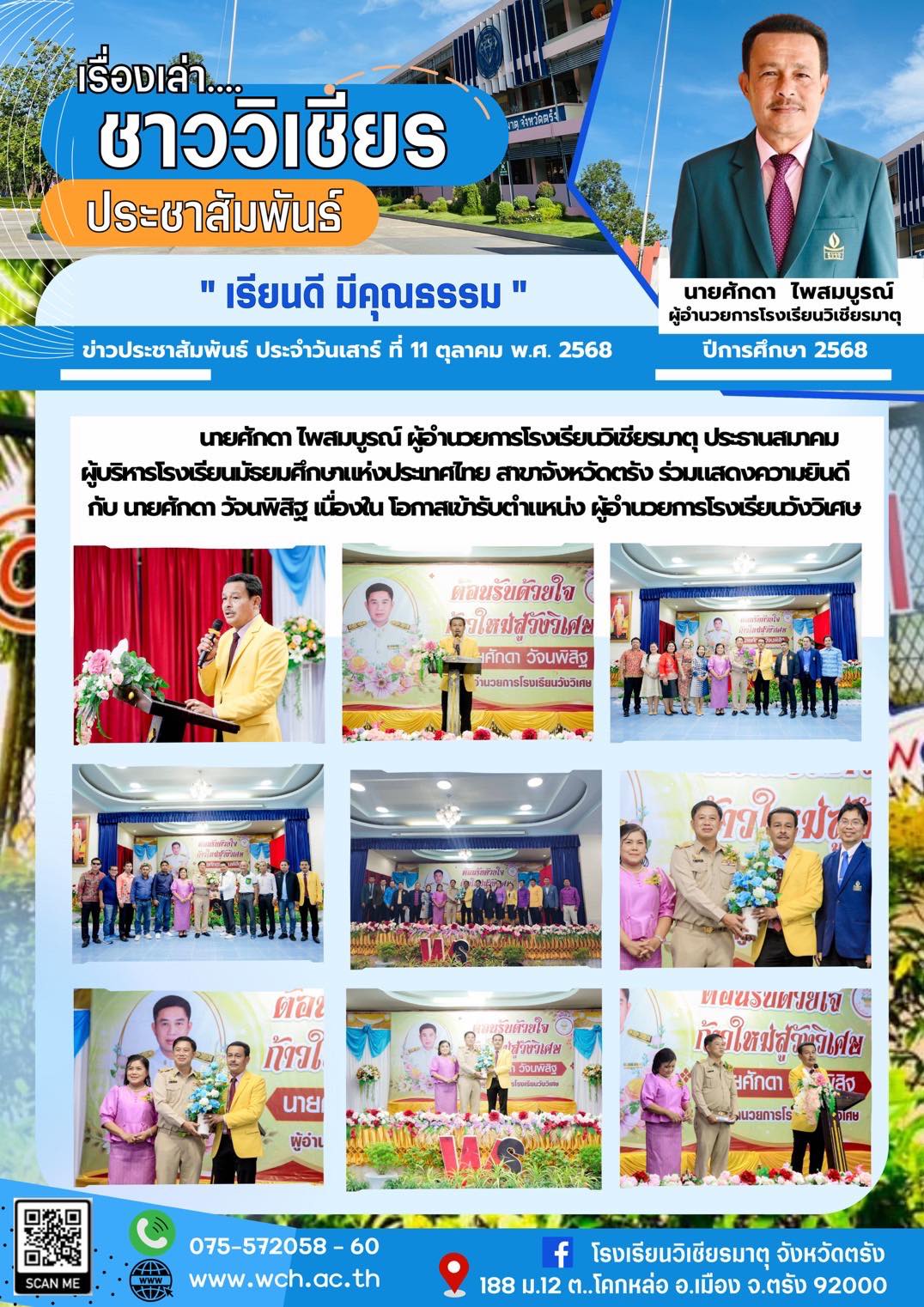 นายศักดา ไพสมบูรณ์ ผู้อำนวยการโรงเรียนวิเชียรมาตุ ประธานสมาคมผู้บริหารโรงเรียนมัธยมศึกษาแห่งประเทศไทย สาขาจังหวัดตรัง ร่วมแสดงความยินดีกับ นายศักดา วัจนพิสิฐ เนื่องใน โอกาสเข้ารับตำแหน่ง ผู้อำนวยการโรงเรียนวังวิเศษ
