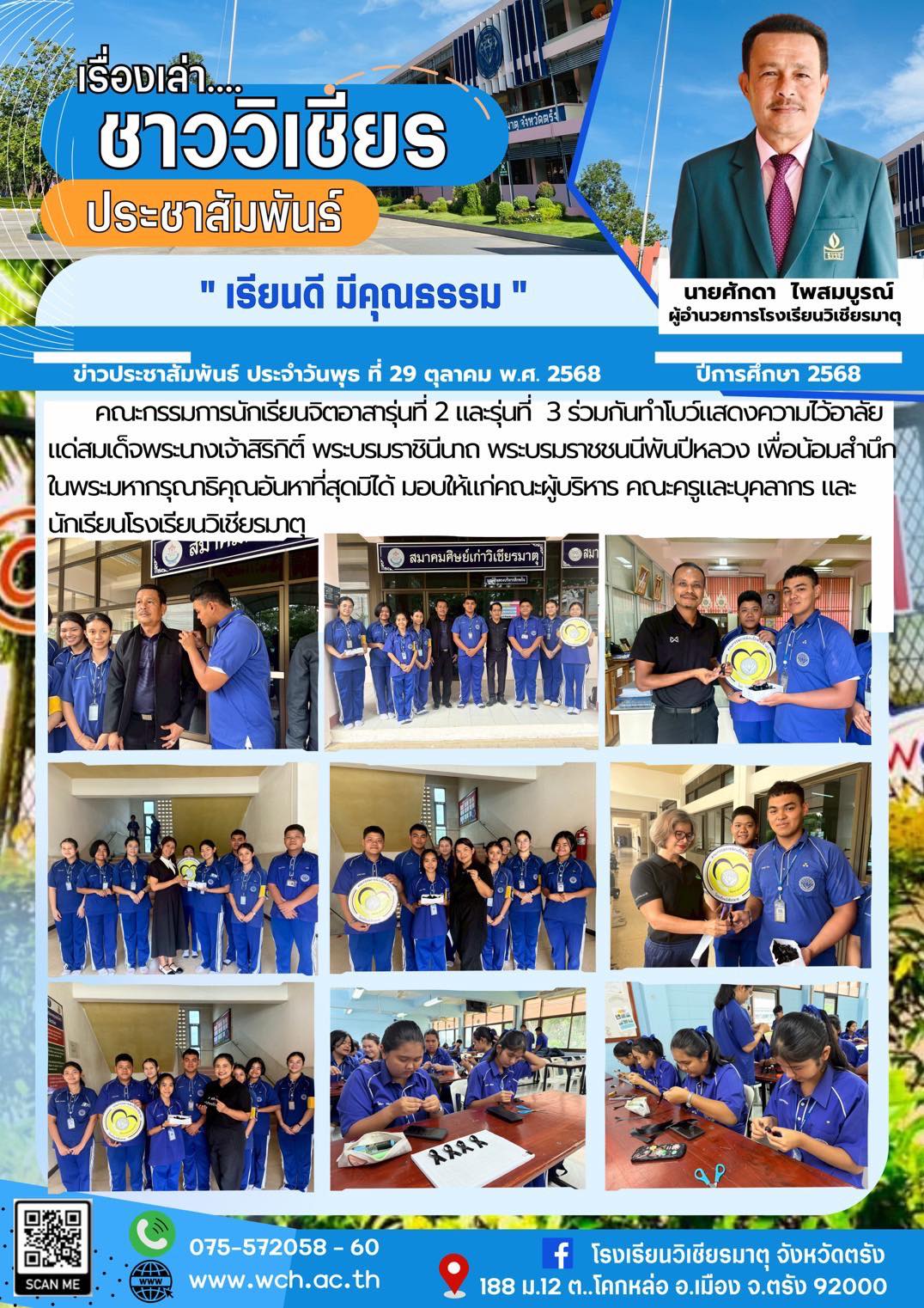 คณะกรรมการนักเรียนจิตอาสารุ่นที่ 2 และรุ่นที่ 3 ร่วมกันทำโบว์แสดงความไว้อาลัย แด่สมเด็จพระนางเจ้าสิริกิติ์ พระบรมราชินีนาถ พระบรมราชชนนีพันปีหลวง เพื่อน้อมสำนึกในพระมหากรุณาธิคุณอันหาที่สุดมิได้ มอบให้แก่คณะผู้บริหาร คณะครูและบุคลากร และนักเรียนโรงเรียนวิเชียรมาตุ