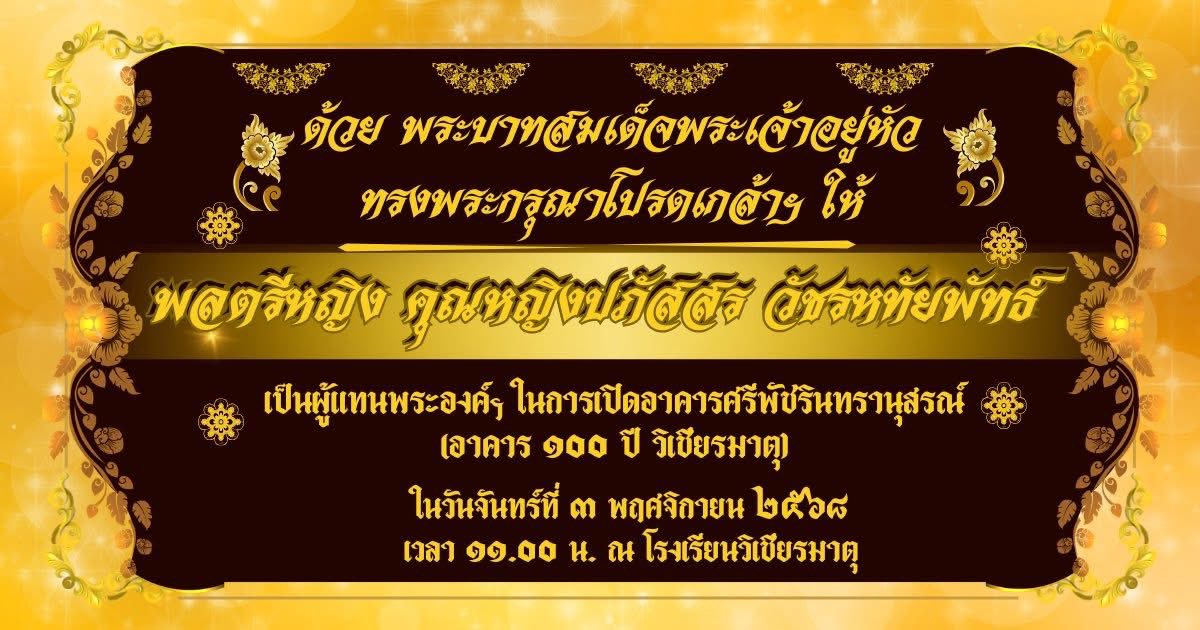 ด้วย พระบาทสมเด็จพระเจ้าอยู่หัว ทรงพระกรุณาโปรดเกล้าฯ ให้ พลตรีหญิง คุณหญิงปภัสสร วัชรหทัยพัทธ์ เป็นผู้แทนพระองค์ฯ ในการเปิดอาคารศรีพัชรินทรานุสรณ์ (อาคาร ๑๐๐ ปี วิเชียรมาตุ)